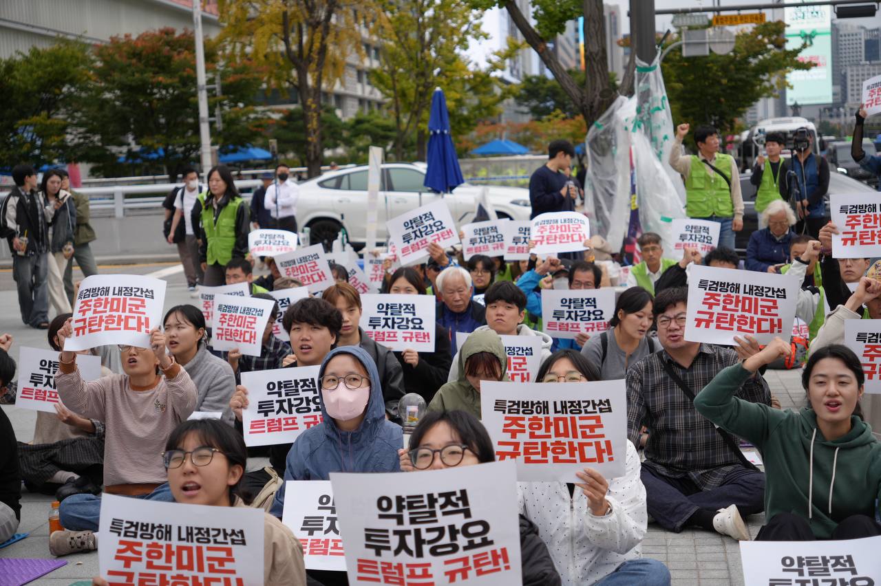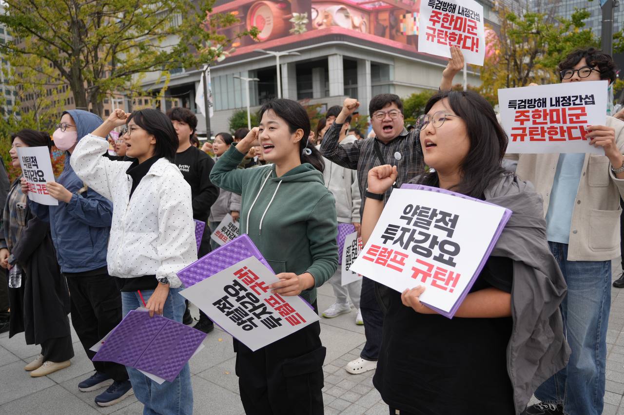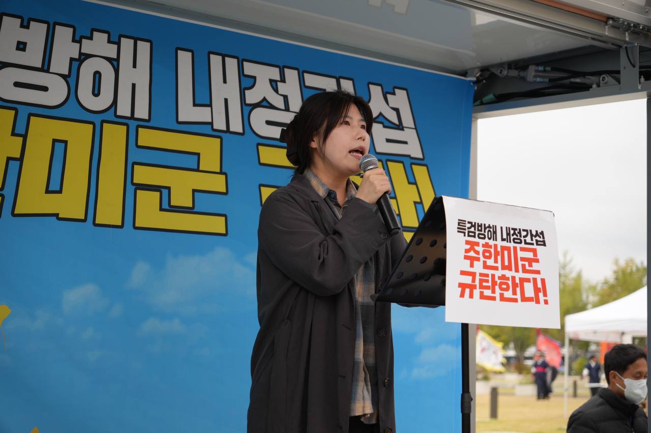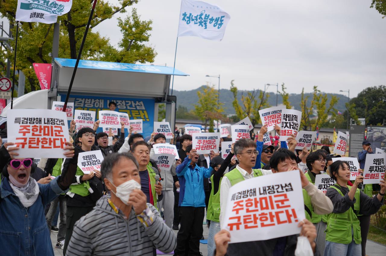 소식/활동 소식 2025. 10. 18. [사진] 특검방해 내정간섭 주한미군 규탄집회 글자 작게 글자 크게 인쇄 공유 닫기 이 글을 공유합니다. 카카오스토리 페이스북 네이버블로그 트위터 링크복사 글 작성 : 2025년 10월 18일 글 제목 : [사진] 특검방해 내정간섭 주한미군 규탄집회 ■ 영상 [생중계] 특검방해 내정간섭 주한미군 규탄집회 | 10/18(토) 오후 2시, 미대사관 북측 ■ 사진 조하경 국민주권당 청년위원장 (왼쪽) 윤경황 서울촛불행동 공동대표 (오른쪽) 이은지 인천촛불행동 대표 (왼쪽) 백륭 자주독립 대학생 시국 농선단 단장 (오른쪽) 곽성용 광주전남촛불행동 서남지부 사무국장 공유하기 게시글 관리 국민주권당 저작자표시 (새창열림)