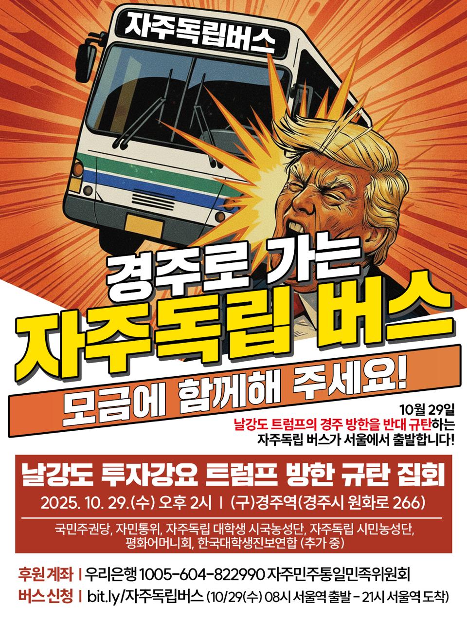💥29일, 날강도 트럼프의 경주 방한을 반대 규탄하는 자주독립 버스가 출발합니다!