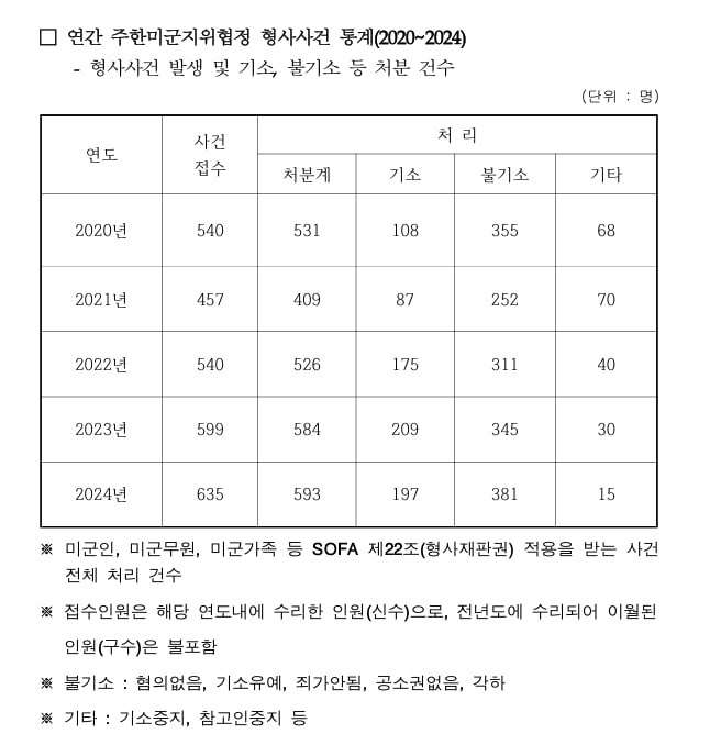 자료실 2025. 11. 4. 주한미군 최근 범죄 현황(2020~2024) 글자 작게 글자 크게 인쇄 공유 닫기 이 글을 공유합니다. 카카오스토리 페이스북 네이버블로그 트위터 링크복사 글 작성 : 2025년 11월 04일 글 제목 : 주한미군 최근 범죄 현황(2020~2024) 자료 : 대검찰청 공유하기 게시글 관리 국민주권당 저작자표시 (새창열림)