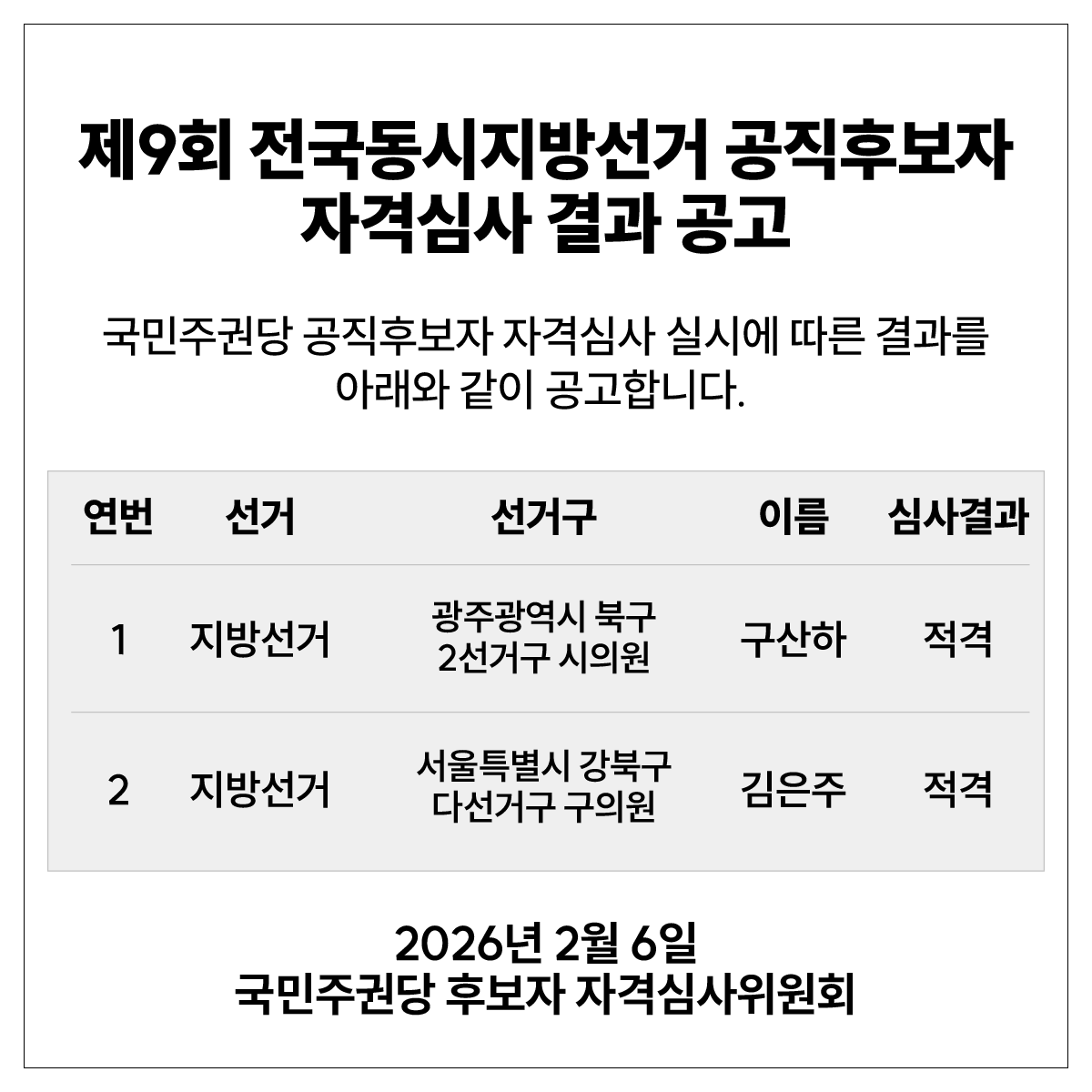 소식/공지 2026. 2. 6. 제9회 전국동시지방선거 공직후보자 자격심사 결과 공고 글자 작게 글자 크게 인쇄 공유 닫기 이 글을 공유합니다. 카카오스토리 페이스북 네이버블로그 트위터 링크복사 글 작성 : 2026년 02월 06일 글 제목 : 제9회 전국동시지방선거 공직후보자 자격심사 결과 공고 공유하기 게시글 관리 국민주권당 저작자표시 (새창열림)