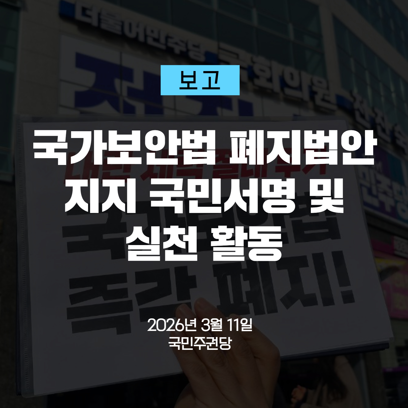 이러한 목소리에 부응하고자 국민주권당은 1월 26일 자민통위 등 여러 단체들과 함께 내란세력의 절대무기인 '국가보안법 폐지 집중 실천 기간'을 선포하고, '국가보안법 폐지법안 지지 국민서명운동' 등을 시작했습니다. 현재 1,090명(온라인 493명, 자필 597명)의 국민이 서명을 하였습니다.