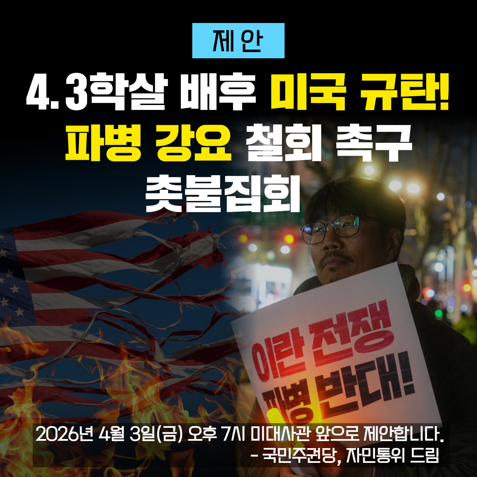 ‘4.3학살 배후 미국 규탄! 파병 강요 철회 촉구 촛불집회’를 함께 만들어 갈 것을 제안합니다.
