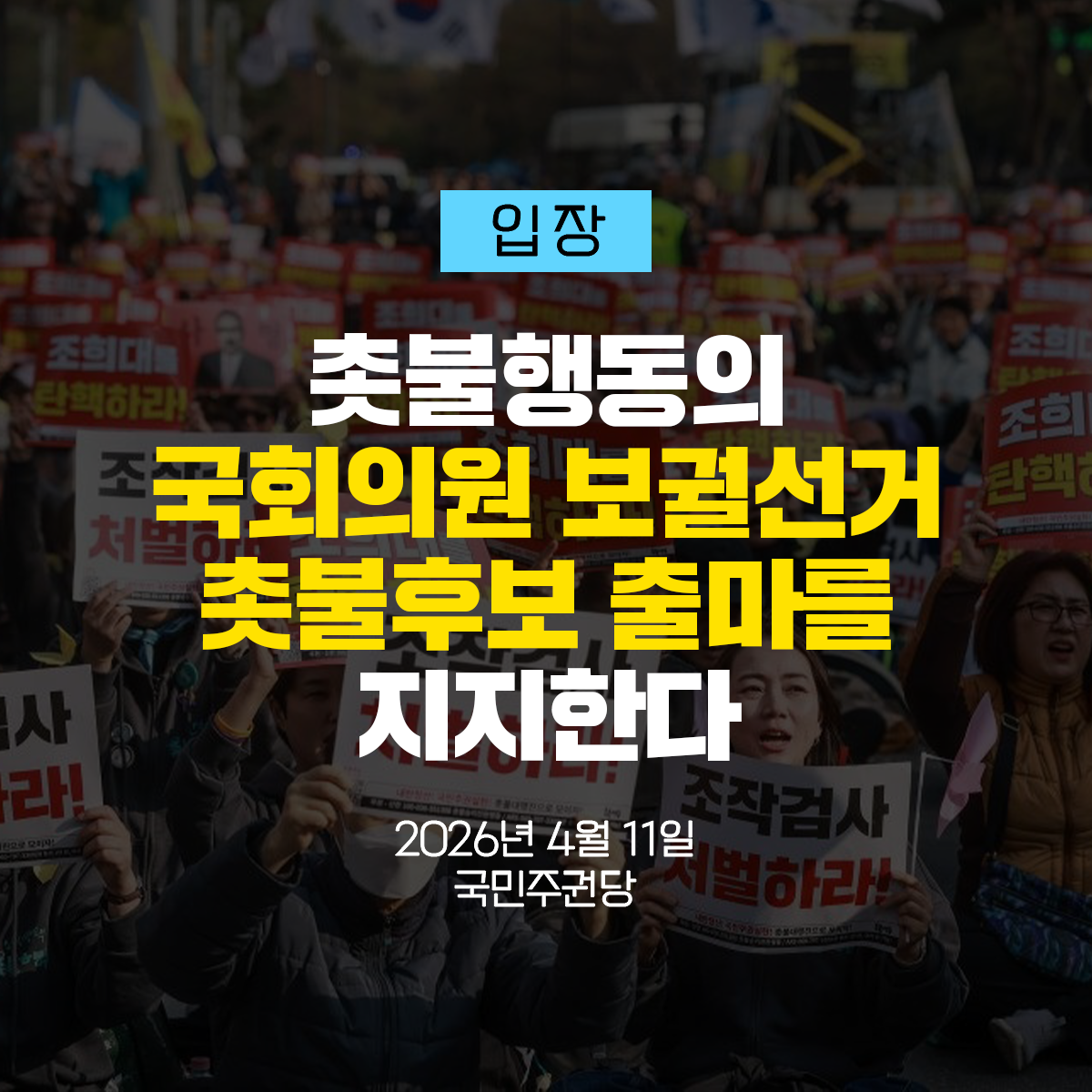 촛불행동이 국회의원 보궐선거 출마 추진의 결단을 했습니다. 내란 세력 청산과 국민주권 정치를 실현하려는 그 결단에 국민주권당은 전적인 지지를 보냅니다. 이번 움직임은 단순히 의석 확보를 위한 시도가 아닙니다. 광장을 지켜온 민심이 이제 국회까지 직접 책임지겠다는 당당한 결심이자, 촛불국민의 손으로 내란 청산을 완수하겠다는 주권자의 선언입니다.