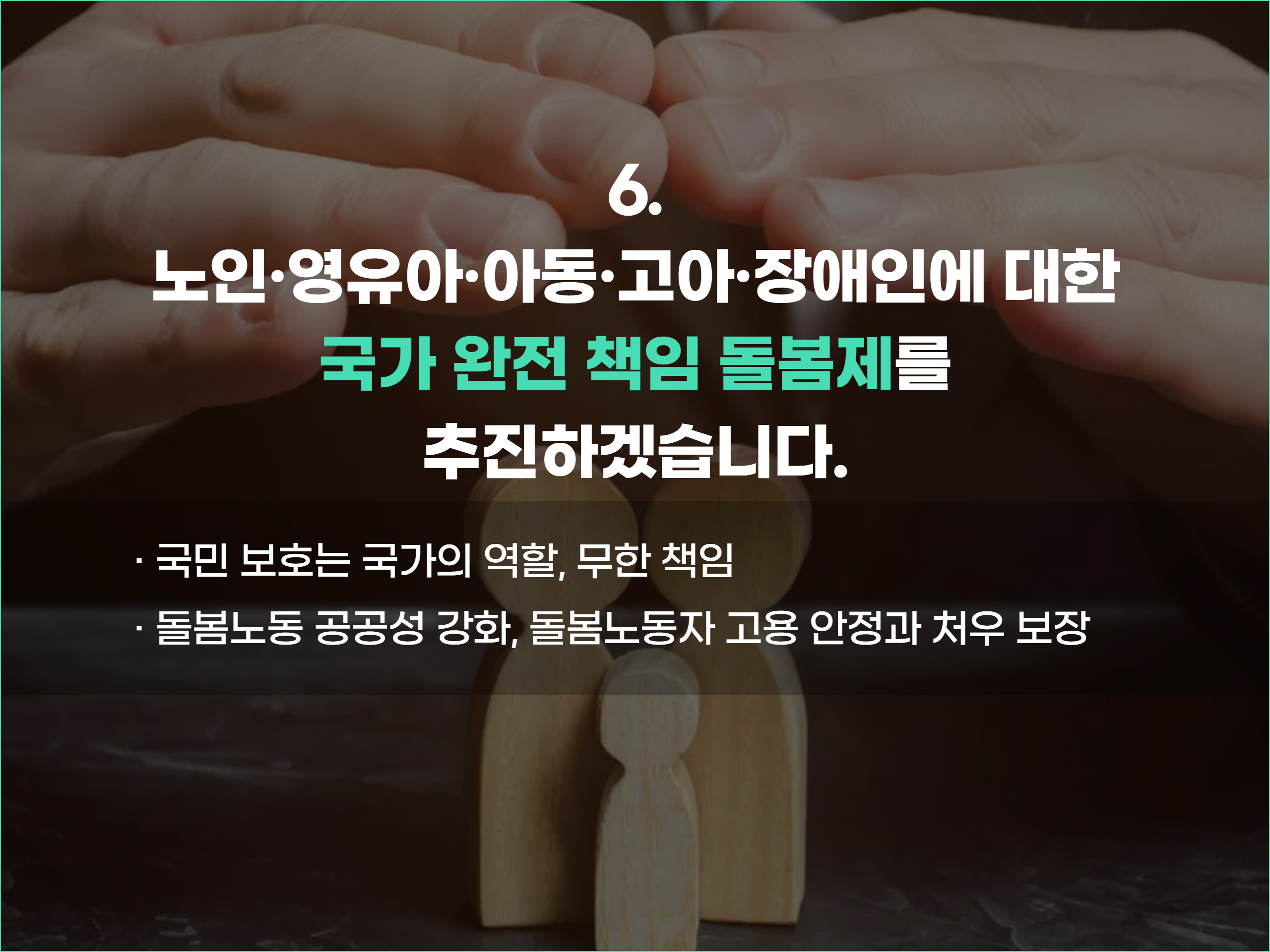 6. 노인·영유아·아동·고아·장애인에 대한 국가 완전 책임 돌봄제를 추진하겠습니다.