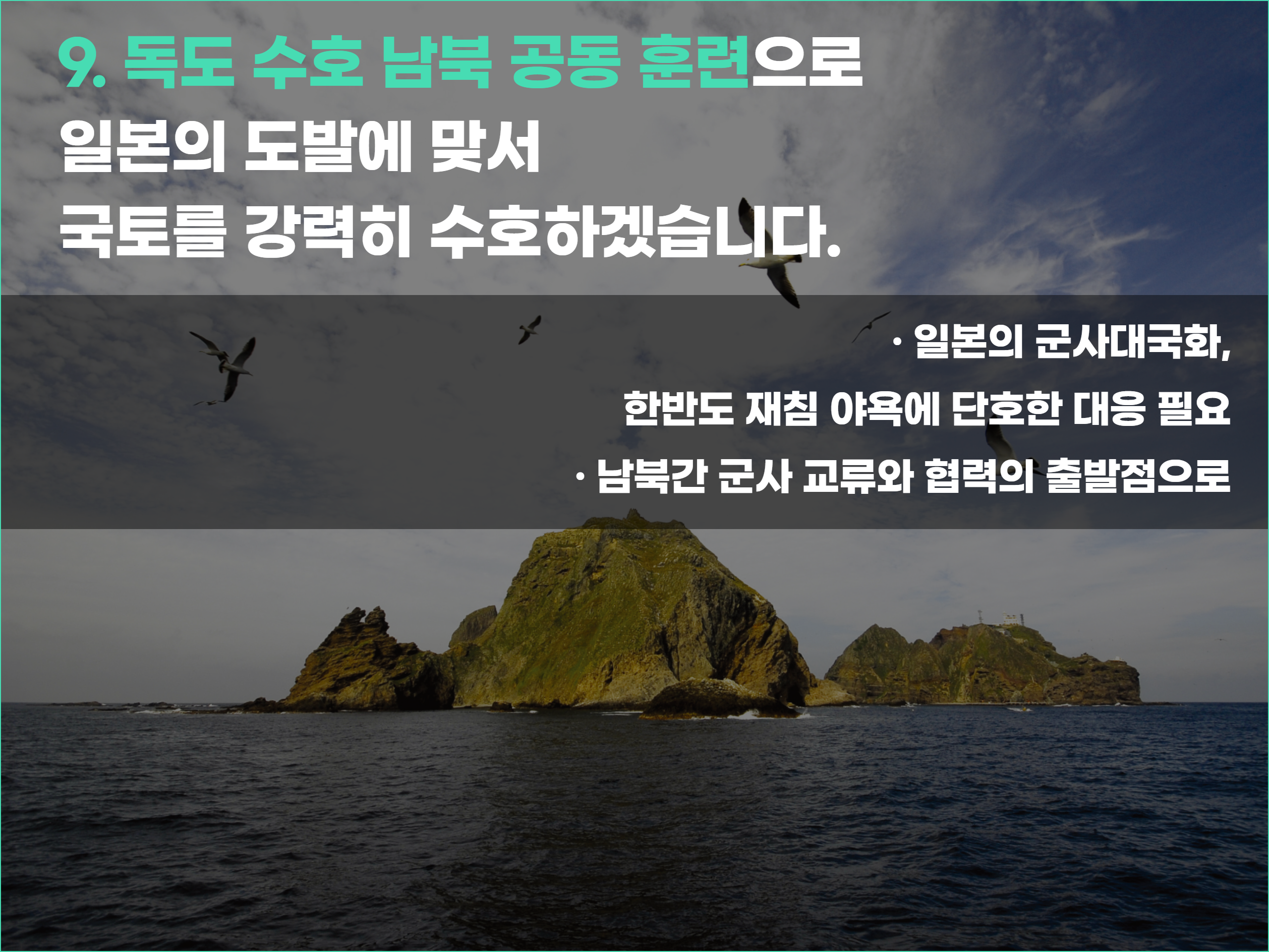9. 독도 수호 남북 공동 훈련으로 일본의 도발에 맞서 국토를 강력히 수호하겠습니다.