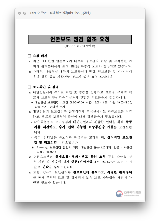 이동관이 대변인이던 시절인 2008년 3월 18일 청와대 대변인실 국민소통비서관실에서 작성한 ‘언론보도 점검 협조 요청’ 문서를 보면, 이명박 정권은 언론보도를 수시로 통제했음을 알 수 있다. 이명박 정권은 조간은 아침 6시, 석간은 오후 1시, 가판은 오후 7시에 보도를 점검했다. “부정적 보도 및 정제되지 않은 보도 가능성을 사전에 차단”한다는 목적이었다. 보도 내용 중에 거슬리는 것이 있다면 조치를 통해 더 이상 보도되지 않도록 막았다.