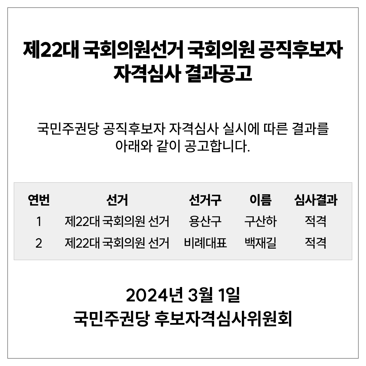 소식/공지 2024. 3. 1. 제22대 국회의원선거 국회의원 공직후보자 자격심사 결과공고 글자 작게 글자 크게 인쇄 공유 닫기 이 글을 공유합니다. 카카오스토리 페이스북 네이버블로그 트위터 링크복사 글 작성 : 2024년 03월 01일 글 제목 : 제22대 국회의원선거 국회의원 공직후보자 자격심사 결과공고 공유하기 게시글 관리 국민주권당 저작자표시 (새창열림)