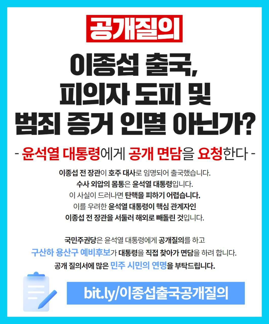 이상에 대해 공개 질의하는 바이다. 윤석열 대통령에게 공개 면담을 요청한다.