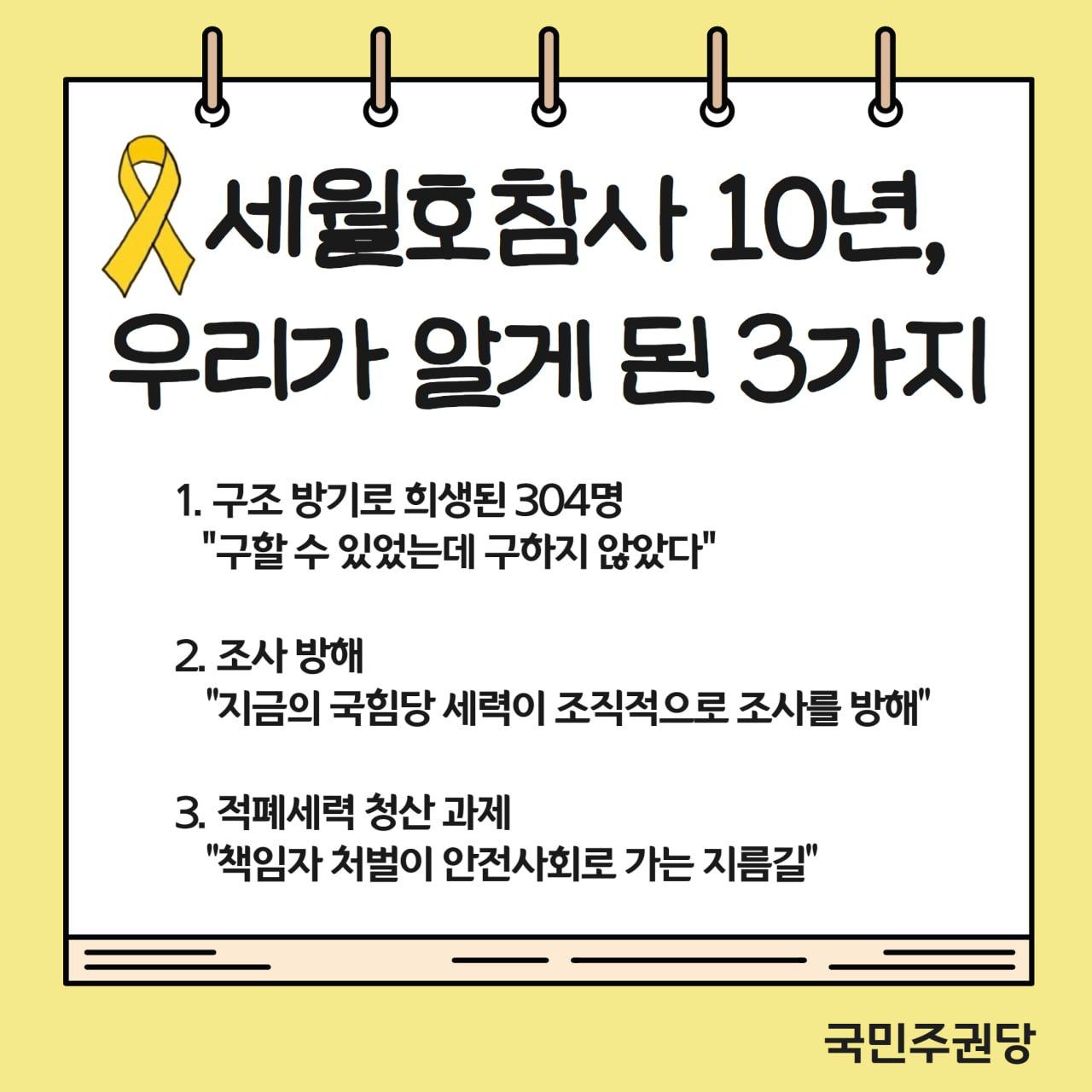 세월호참사 후 지금까지도 세월호참사 유가족들과 국민들은 책임자처벌을 강력히 요구하고 있습니다. 국가의 잘못은 명백하며 구조방기 책임자, 조사방해 책임자 모조리 다 처벌해야 합니다. 이에 연루된 핵심세력이 바로 지금의 국힘당 세력입니다.