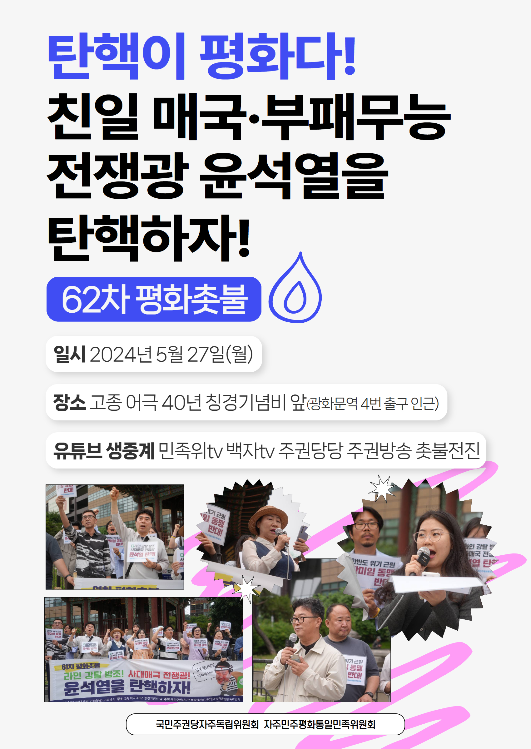 이처럼 미·일 편중적이고 굴종적인 외교·안보 행보로 나라를 위기로 내몰고 있는 윤석열 정권을 하루도 더는 그냥 둘 수 없습니다. 함께 외칩시다. 탄핵이 평화다! 친일 매국·부패무능 전쟁광 윤석열을 탄핵하자!