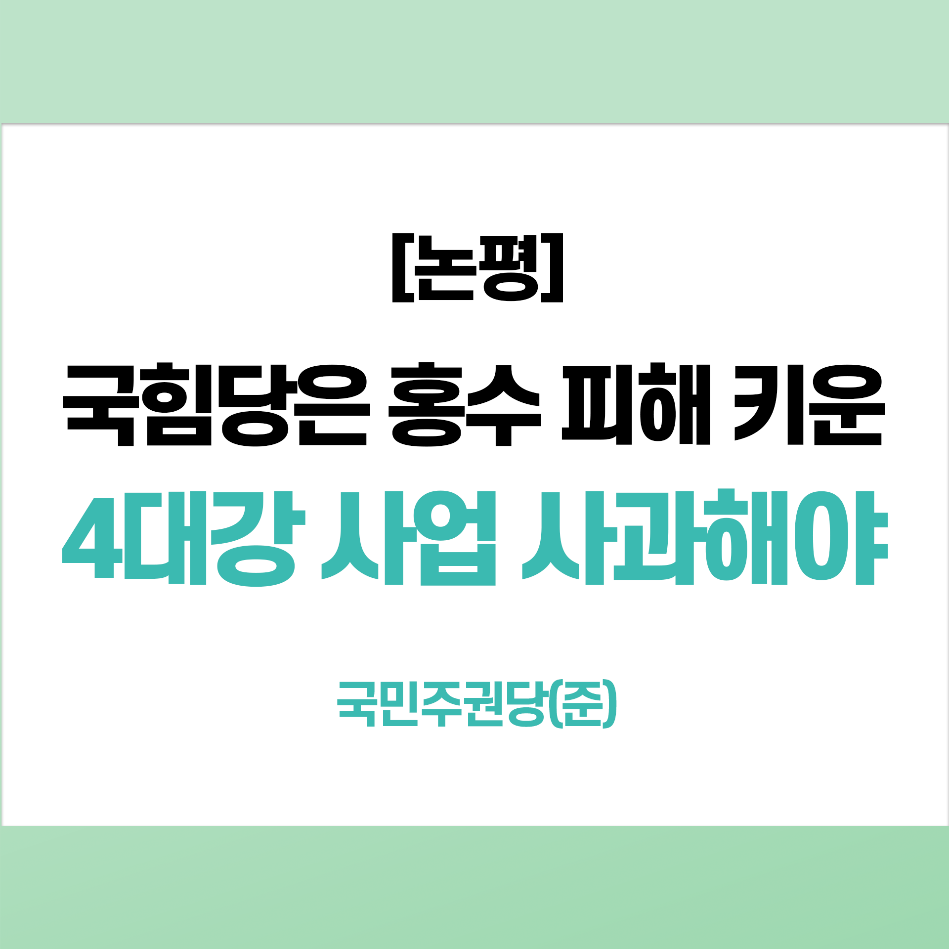 국힘당은 수해를 두고 4대강 사업을 중단시킨 야당 탓을 하지만, 4대강 사업이 수해를 키웠다는 것이 더 사실에 부합한다. 국힘당은 적반하장식의 야당 탓을 그만두고 수해를 입은 국민에게 자신의 잘못된 정책을 사죄해야 할 것이다.