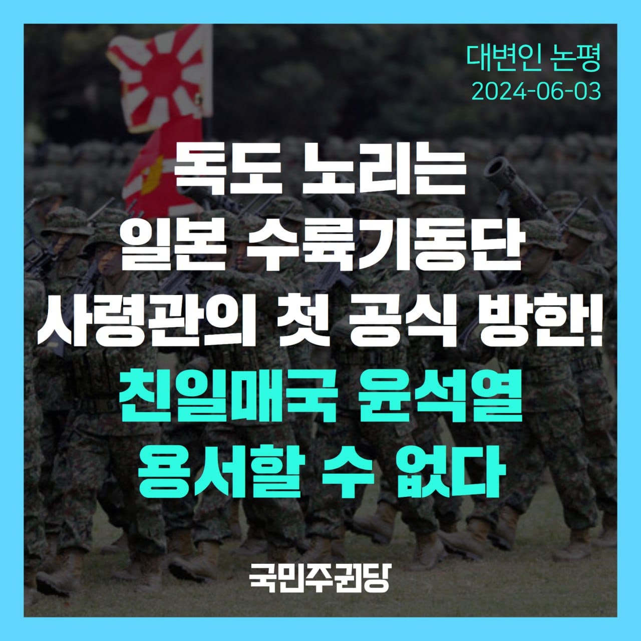 대한민국 대통령이라면, 군 통수권자라면 해당 부대의 존재와 훈련 내용을 강력히 규탄해야 마땅합니다. 그런데 윤석열 대통령은 독도를 탈환하는 부대 사령관을 수도 한복판에 공개적으로 불러들인 것입니다. 일본의 군국주의 부활 움직임에 힘을 실어주고 자위대의 한반도 침략을 용인해 주는 만행입니다.