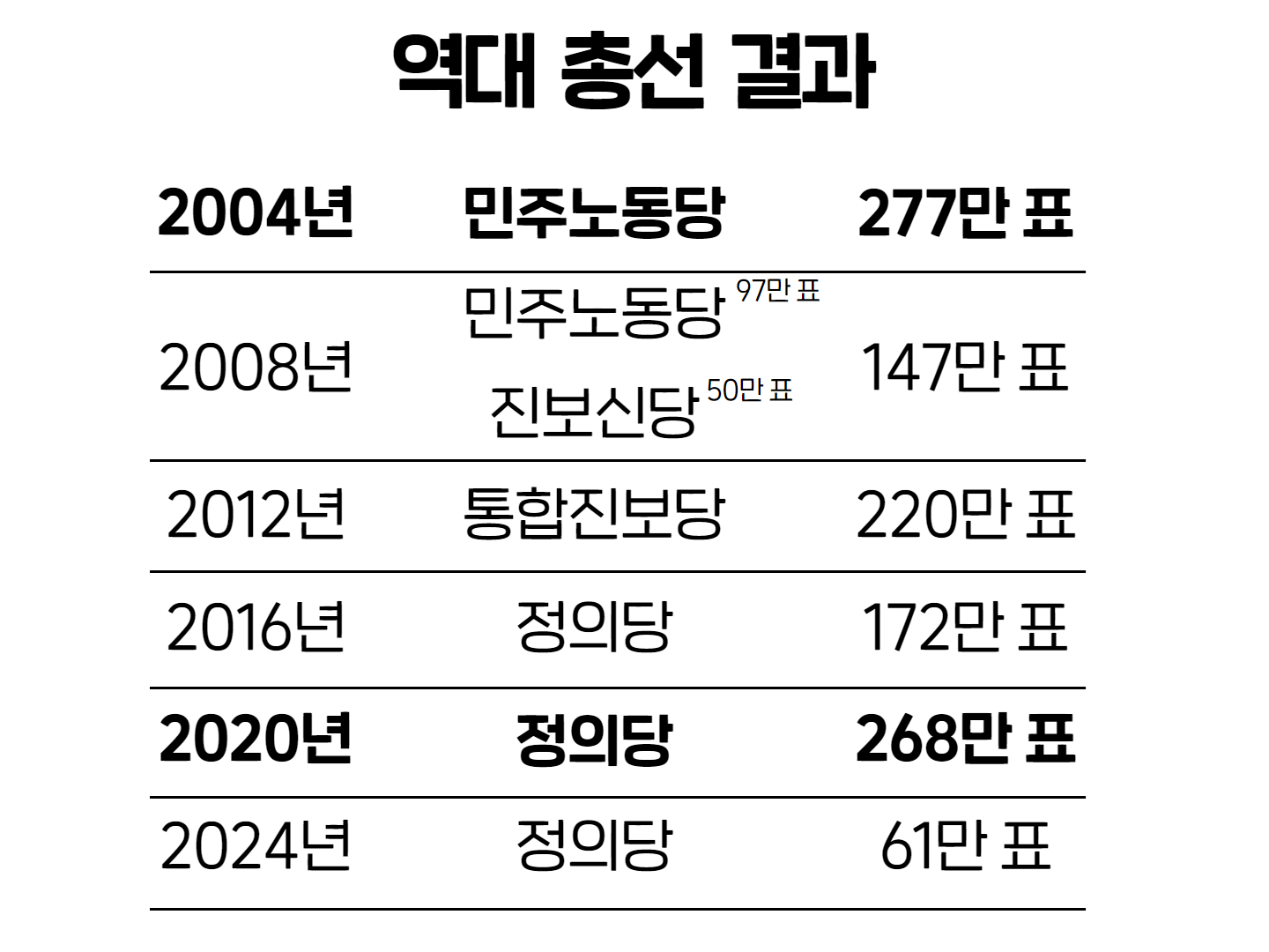 역대 총선 비례대표 투표 결과를 보면 2004년 총선에서 민주노동당 277만 표, 2008년 총선에서 민주노동당과 진보신당을 합쳐 148만 표, 2012년 통합진보당 220만 표, 2016년 정의당 172만 표를 얻었다.