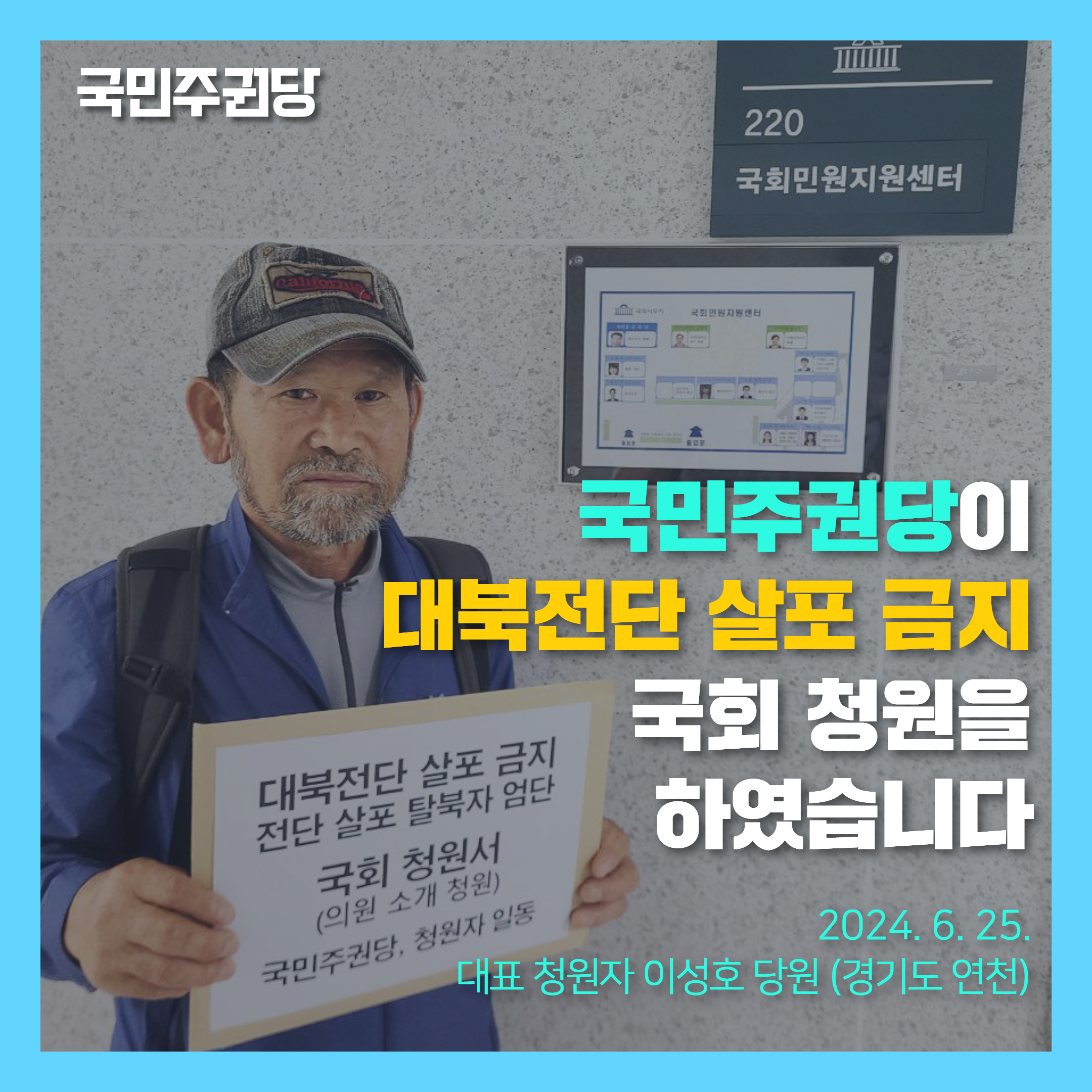 6월 25일 국민주권당은 '대북전단 살포 금지와 전단 살포 탈북자 엄단'에 관한 국회 청원서를 국회 사무처에 접수하였습니다. 청원서는 22대 국회에 정식 등록되었고, 국회의장에게 전달 됩니다.