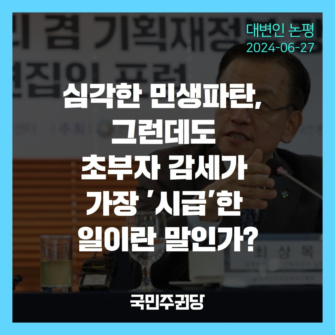 소식/성명·논평 2024. 6. 27. [대변인 논평] 심각한 민생파탄, 그런데도 초부자 감세가 가장 '시급'한 일이란 말인가? 글자 작게 글자 크게 인쇄 공유 닫기 이 글을 공유합니다. 카카오스토리 페이스북 네이버블로그 트위터 링크복사 글 작성 : 2024년 06월 27일 글 제목 : [대변인 논평] 심각한 민생파탄, 그런데도 초부자 감세가 가장 '시급'한 일이란 말인가? [대변인 논평] 심각한 민생파탄, 그런데도 초부자 감세가 가장 '시급'한 일이란 말인가? 최상목 부총리 겸 기획재정부 장관이 "상속세 개편이 시급"하다며 7월 말 세법 개정안에 담겠다고 발언했습니다. 자영업자의 대출 연체율이 급증해 11년 만에 최고치를 기록하고, 실질 임금은 사상 처음으로 2년 연속 감소하는 등 고물가, 고금리, 고환율에 온 국민이 고통받고 있습니다. 나라 경제에 비상등이 켜진 지 오래이고 민생은 파탄 났습니다. 이런 위기 상황에 기획재정부 장관이 가장 '시급'하게 해야 할 일이 초부자 감세입니까? 2022년 기준 상속세 과세 대상이 전체 인구의 0.03%라고 하니, 상속세 완화가 누굴 위한 것인지는 자명합니다. 최상목 부총리의 재산이 1년 만에 2억이 넘게 증가해 42억이 넘었다고 합니다. 지난 1년, 서민은 대출 이자와 빚만 눈덩이처럼 늘어났는데 말입니다. 상속세 완화와 종부세 폐지를 주창한 성태윤 대통령실 정책실장의 재산은 무려 88억 원이라고 합니다. 이래서 서민 경제나 민생에 관심이 없고 국민의 절규가 들리지 않나 봅니다. 자기 세금 적게 내려고 세제 개편안을 들고 나왔나 의심이 들기도 합니다. 윤석열 정권이 추진하는 세제 개편안은 국민의 고혈을 더 짜내서 초부자 기득권의 배를 불리겠다는 추악한 욕망의 발현입니다. 그러면서 국민에게는 '최저'임금마저 깎겠다고 달려들고, 각종 복지 예산을 축소하고 있습니다. 민생 포기, 국민 포기를 선언한 윤석열, 용서할 수 없습니다. 경제와 민생을 살리는 가장 빠른 길, 윤석열 탄핵입니다. 2024년 6월 27일 국민주권당 대변인 구산하 공유하기 게시글 관리 국민주권당 저작자표시 (새창열림)