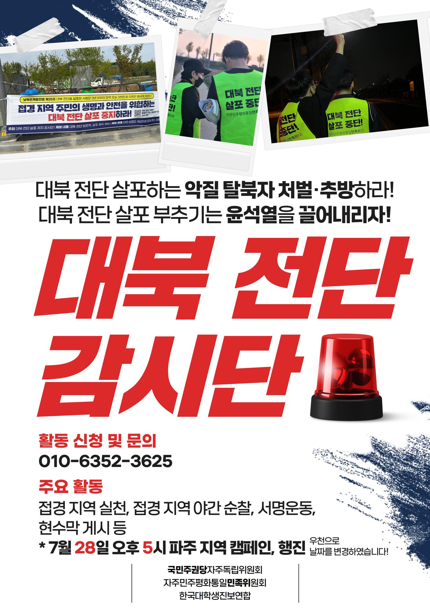 - 대북 전단 감시단 활동을 통해 탄핵의 위기를 전쟁으로 돌파하려는 윤석열에게 맞서 한반도의 평화와 국민의 생명과 안전을 지켜냅시다.