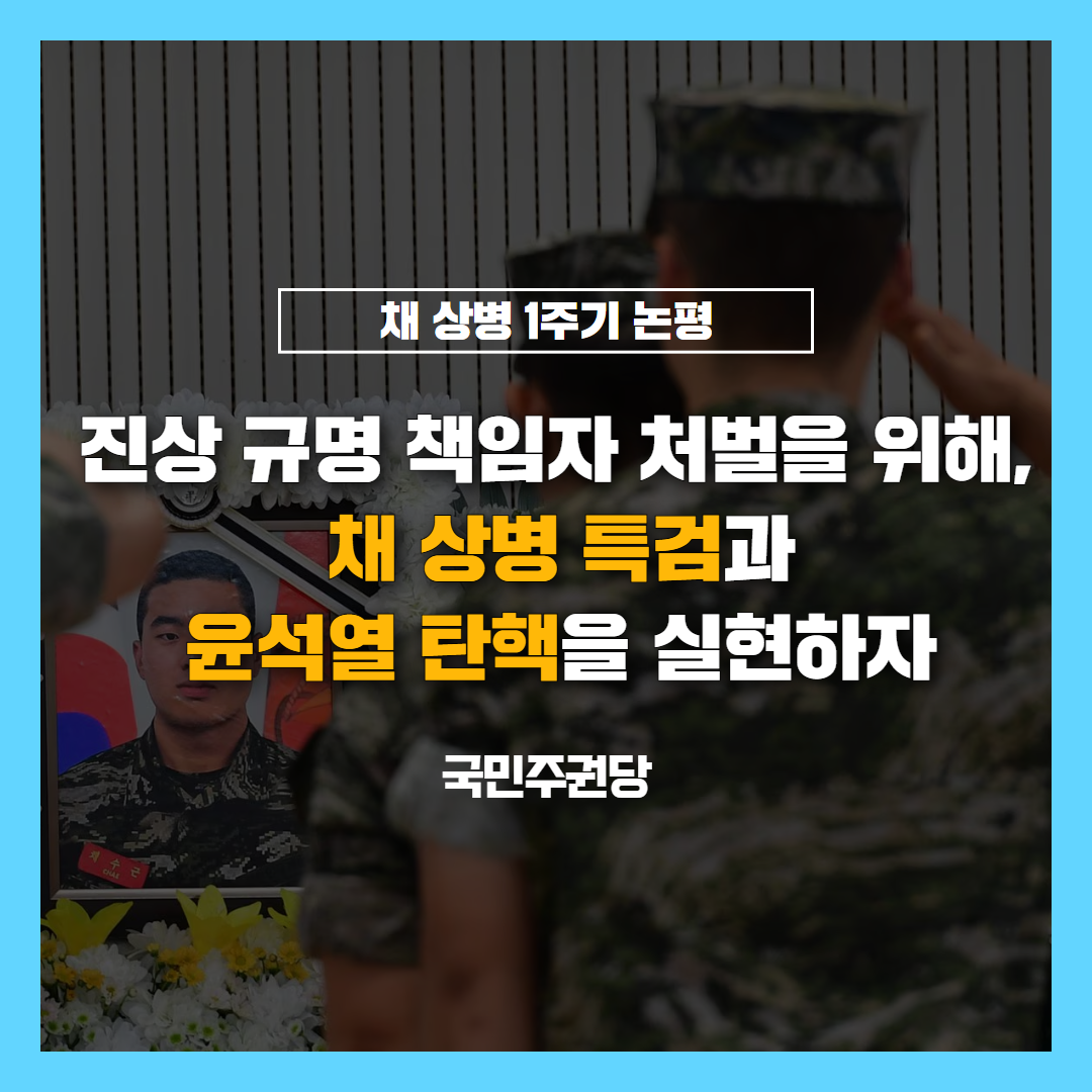 글 제목 : [채 상병 1주기 논평] 진상 규명 책임자 처벌을 위해, 채 상병 특검과 윤석열 탄핵을 실현하자