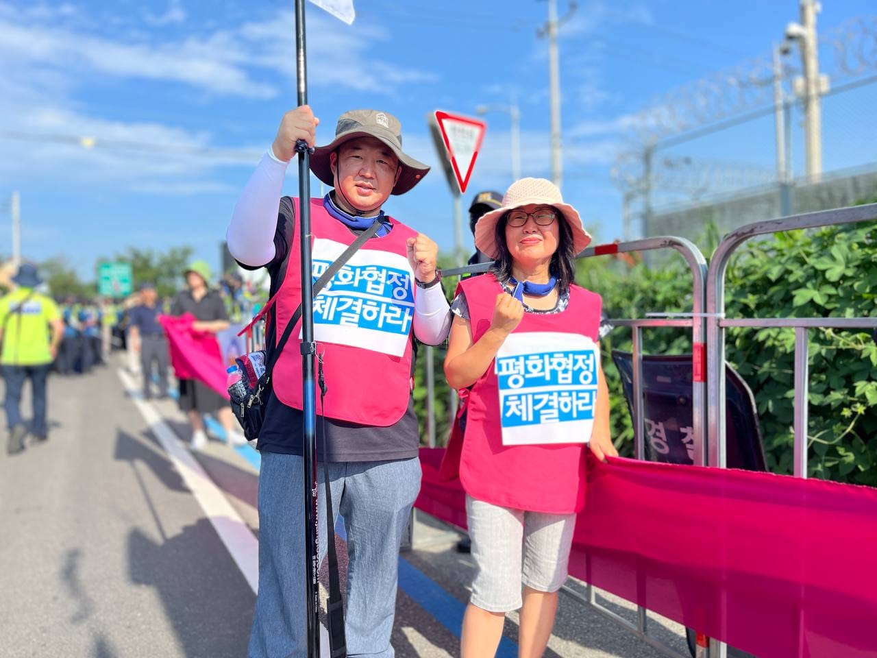 분홍천으로 미국의 동북아군사전략을 수행하는 평택미군기지를 에워싸며 민족의 흥이 절로 나는 풍물가락에 맞춰 평화를 외치는 만장행렬!