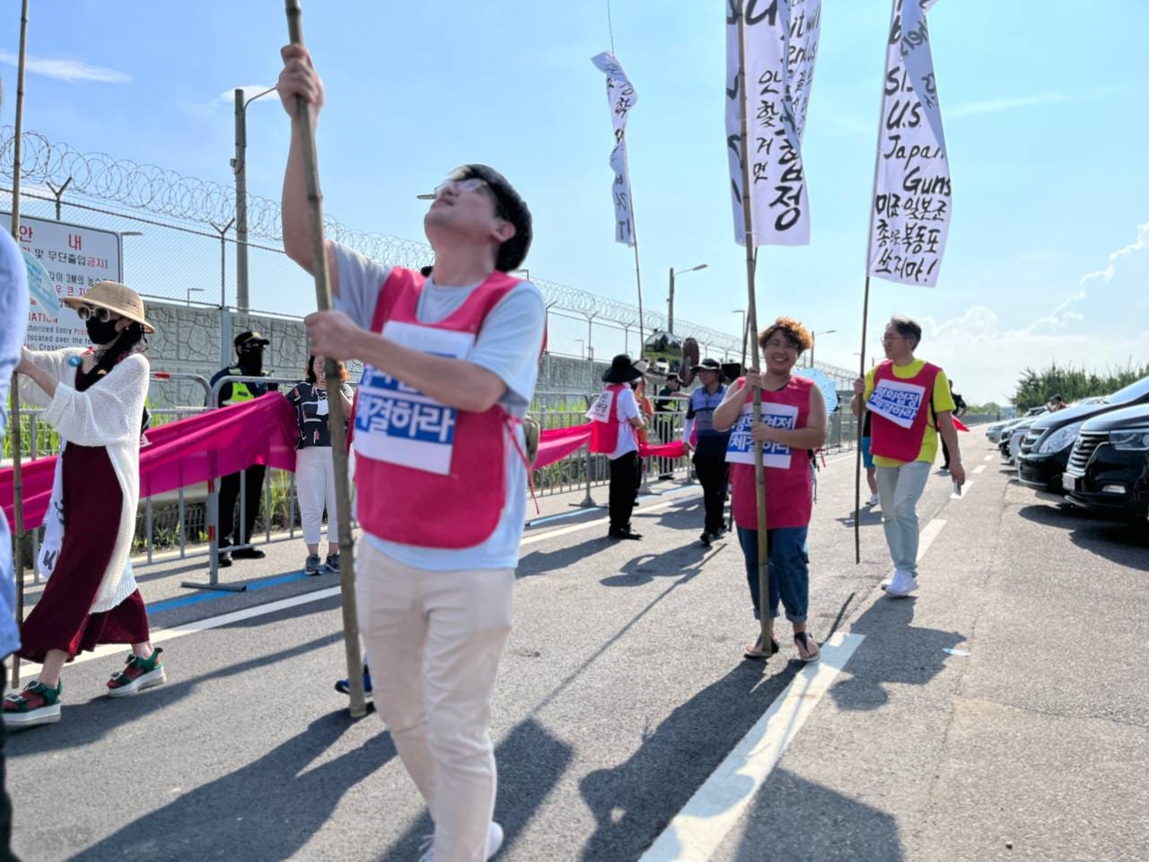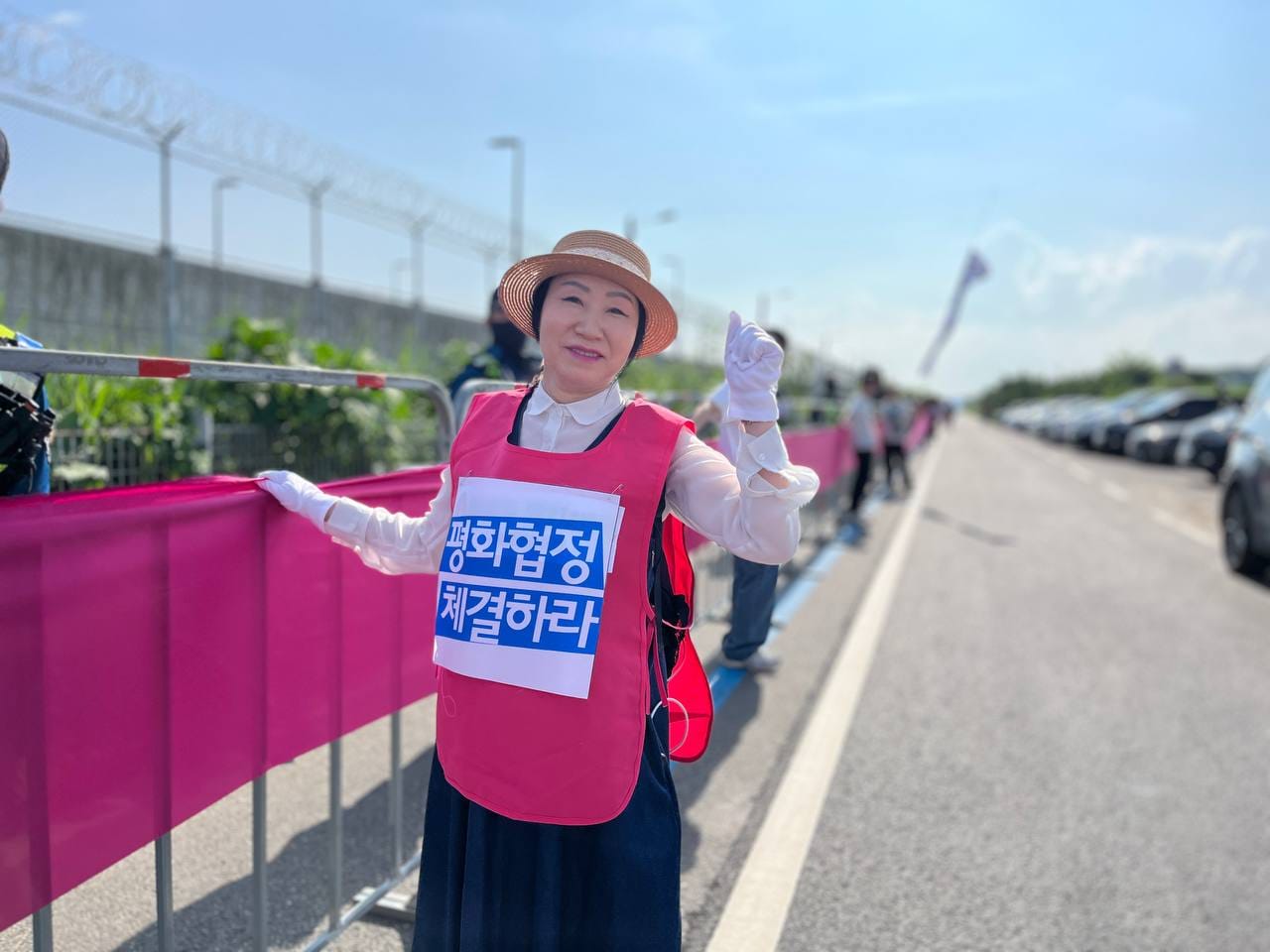 분홍천으로 미국의 동북아군사전략을 수행하는 평택미군기지를 에워싸며 민족의 흥이 절로 나는 풍물가락에 맞춰 평화를 외치는 만장행렬!