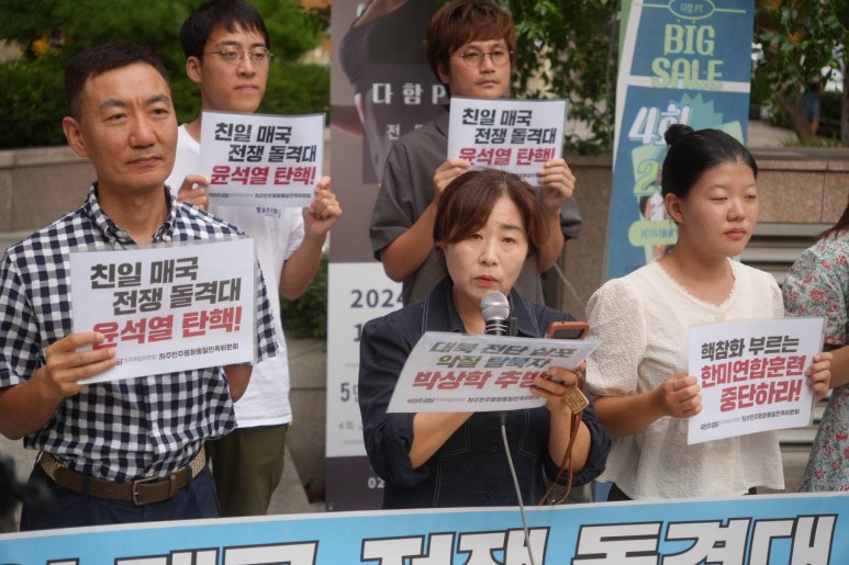 는 게 피부로 느껴집니다. 대한민국 1호 영업사원이라면서 나라를 팔아먹고 다니는데, 윤석열이 이제는 친일파를 넘어 일본놈처럼 느껴집니다”라고 윤석열 정권의 친일 매국 행태를 규탄했습니다. 이어 “윤석열은 떨어지는 자신의 지지율을 어떻게든 붙잡아보려고 전쟁 위기를 고조시키고, 전쟁 돌격대를 자처하고 있습니다”라면서 윤석열 정권의 전쟁 책동 또한 규탄한 뒤 “친일 매국·전쟁 돌격대 윤석열 정권 갈아엎자!”라고 구호를 외쳤습니다.