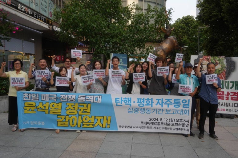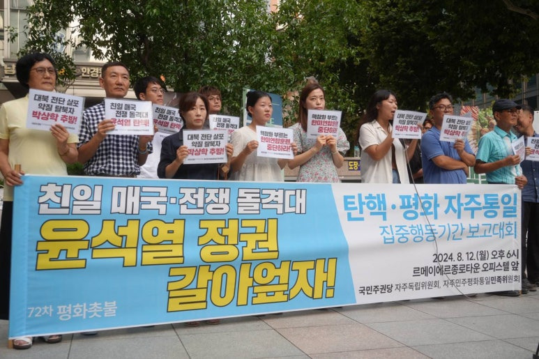 국민주권당 자주독립위원회와 자주민주평화통일민족위원회(민족위)는 12일(월) 오후 6시 르메이에르종로타운 오피스텔 앞에서 72차 평화촛불을 열었습니다. 이날 평화촛불은 ‘친일 매국·전쟁 돌격대 윤석열 정권 갈아엎자!’는 구호 아래 <탄핵·평화 자주통일 집중행동기간> 보고대회로 진행하였습니다.