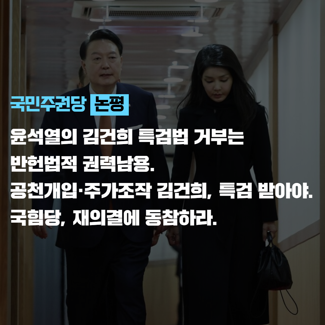 윤석열 대통령이 또다시 김건희 특검법을 거부하였다. 이번이 24번째 거부권 행사다. 김건희의 범죄를 덮기 위해 대통령 권력을 또 남용했다. 이것은 반헌법적 권력 사유화이며 국정농단이다.
