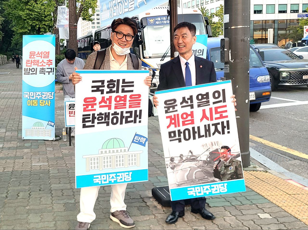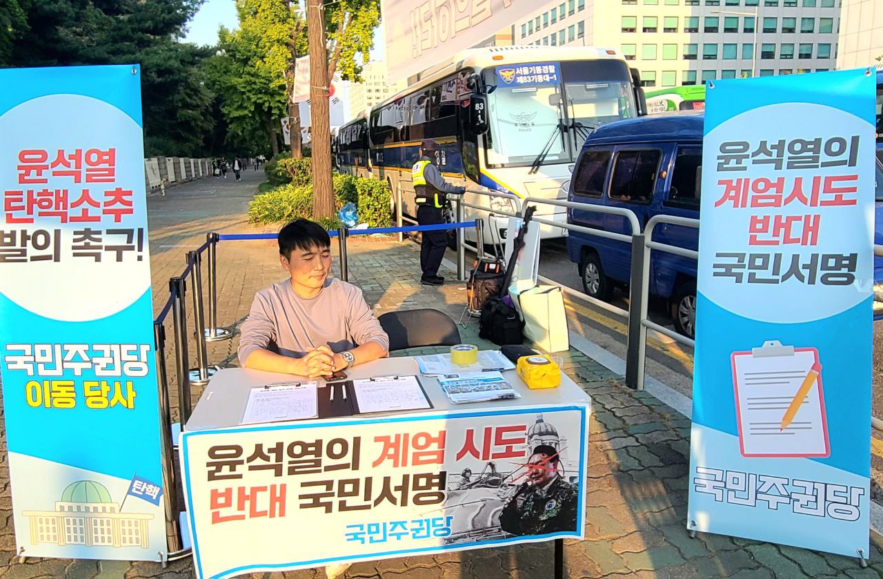국회 정문 앞에서 윤석열 탄핵소추안 발의를 촉구하고, 윤석열의 계엄 시도를 반대하는 서명 및 홍보활동을 했습니다.