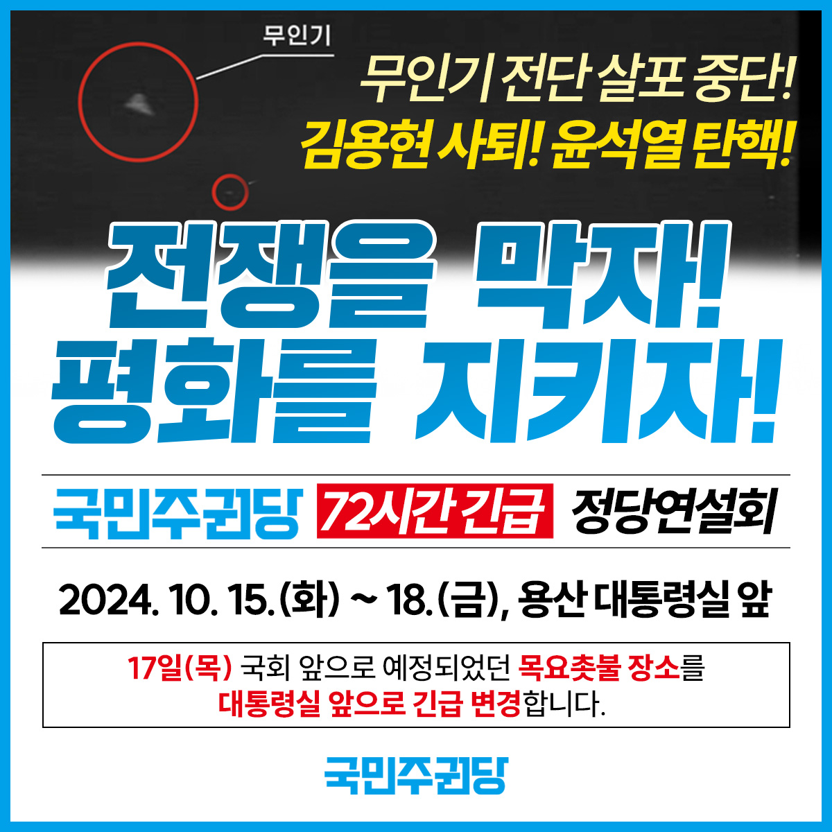 * 긴급 정당연설회가 진행되는 4일간 국회 앞 이동 당사 운영은 하지 않습니다. 10/17 국회 목요촛불 장소도 용산 전쟁기념관 앞으로 변경합니다.
