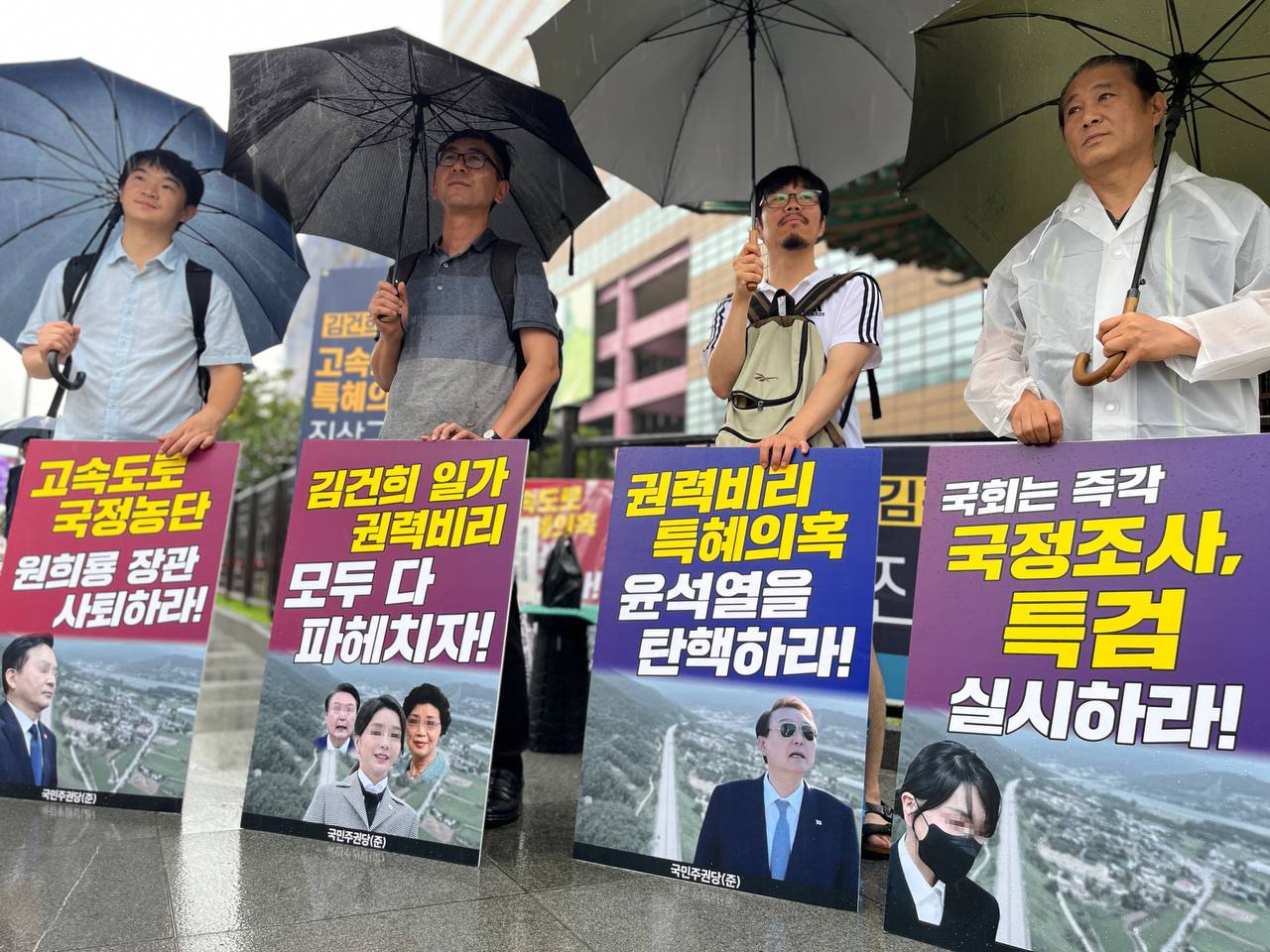 비가 추적추적 내리는 날 임에도 불구하고 국민주권당 박준의 위원장은 기자회견을 열어 공익 감사 청구와 국정조사 및 특검을 촉구하였고, 단식 농성을 시작했다.