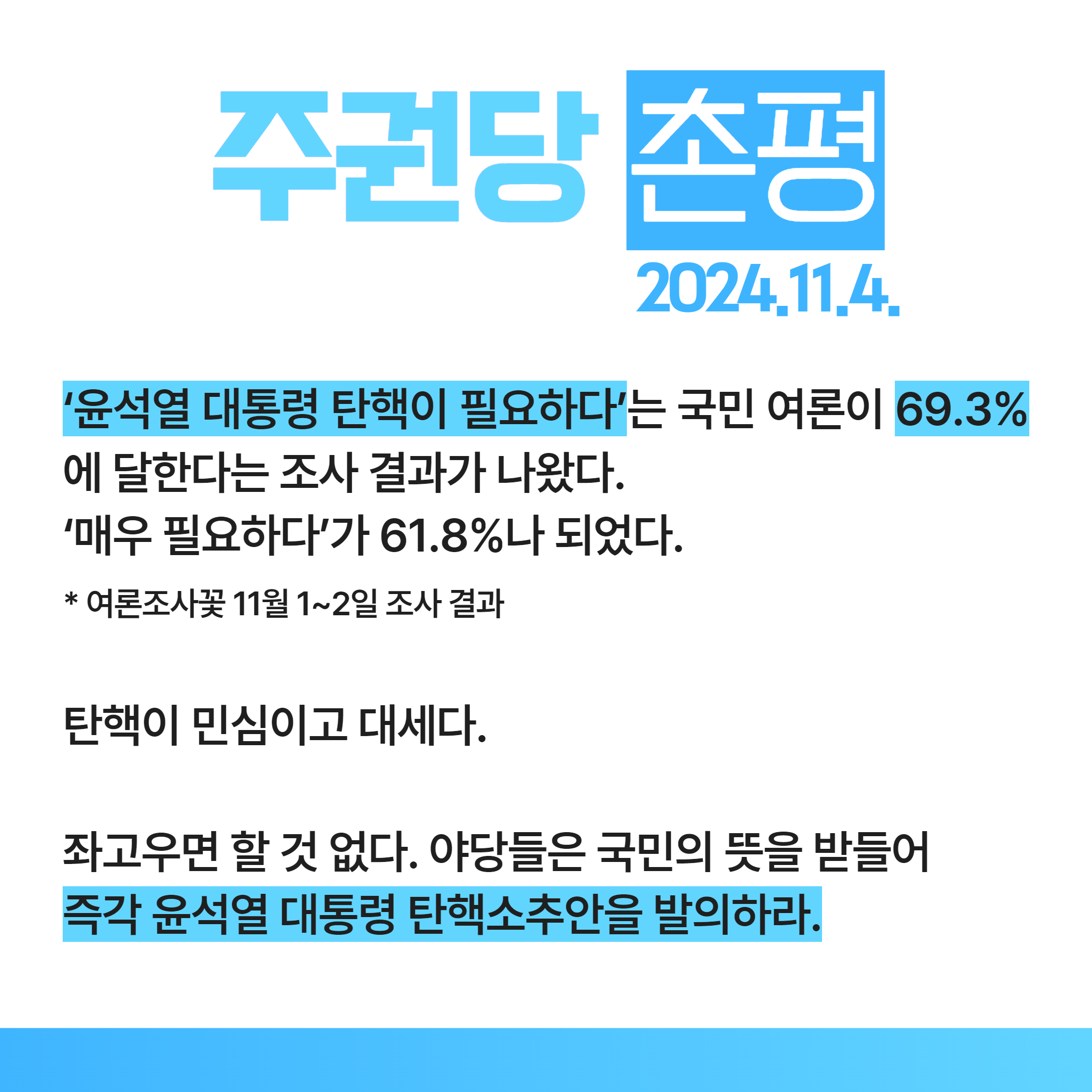 좌고우면 할 것 없다. 야당들은 국민의 뜻을 받들어 즉각 윤석열 대통령 탄핵소추안을 발의하라.