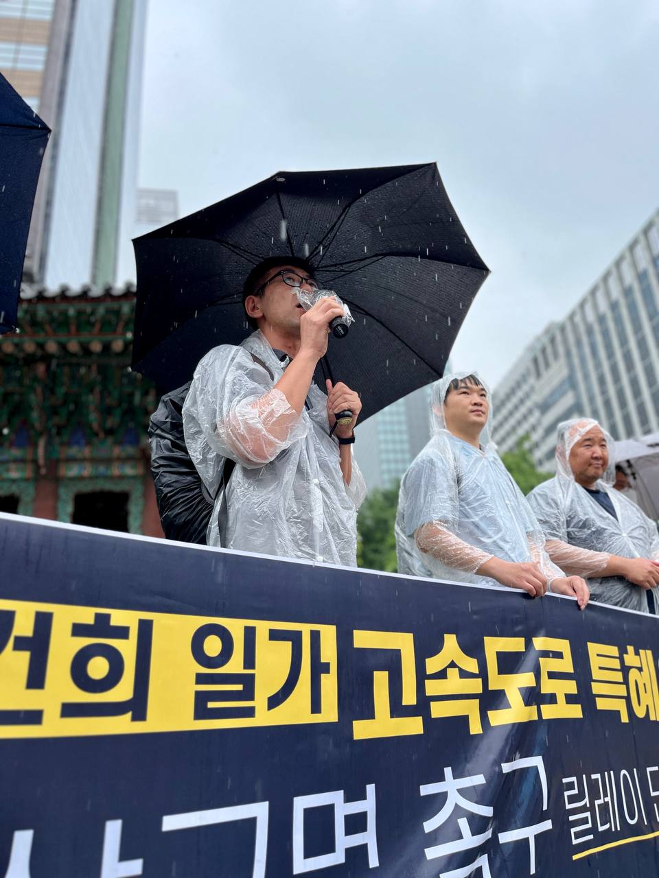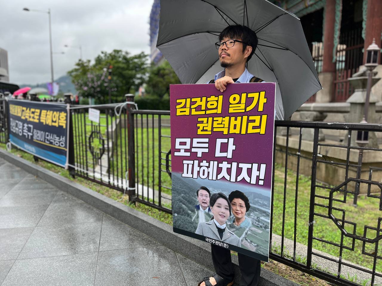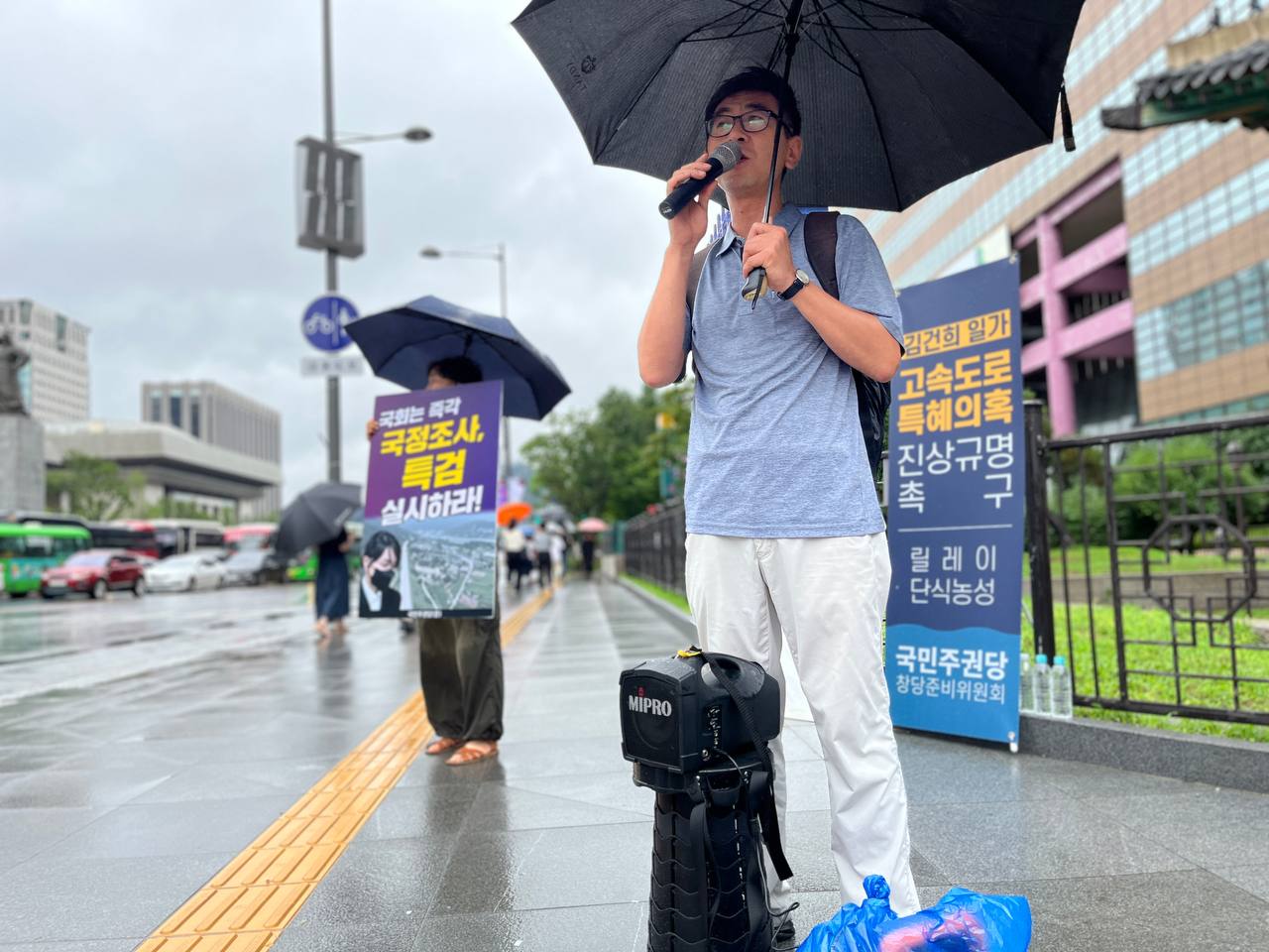 비가 추적추적 내리는 날 임에도 불구하고 국민주권당 박준의 위원장은 기자회견을 열어 공익 감사 청구와 국정조사 및 특검을 촉구하였고, 단식 농성을 시작했다.