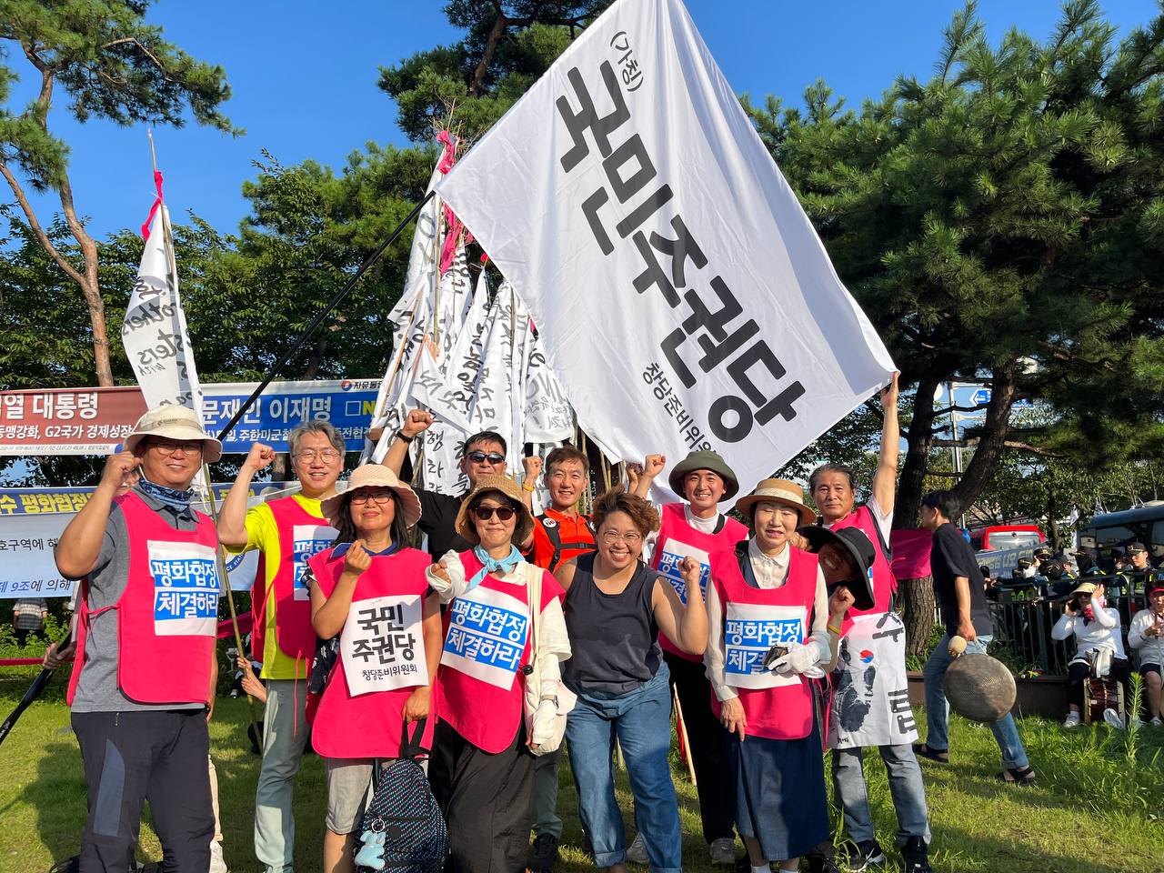 국민주권당 당원들은 "평화협정을 맺지 않는 미군은 더 이상 주둔할 이유도 자격도 없으니 이 땅에서 나가라"라고 힘차게 함성을 질렀다.