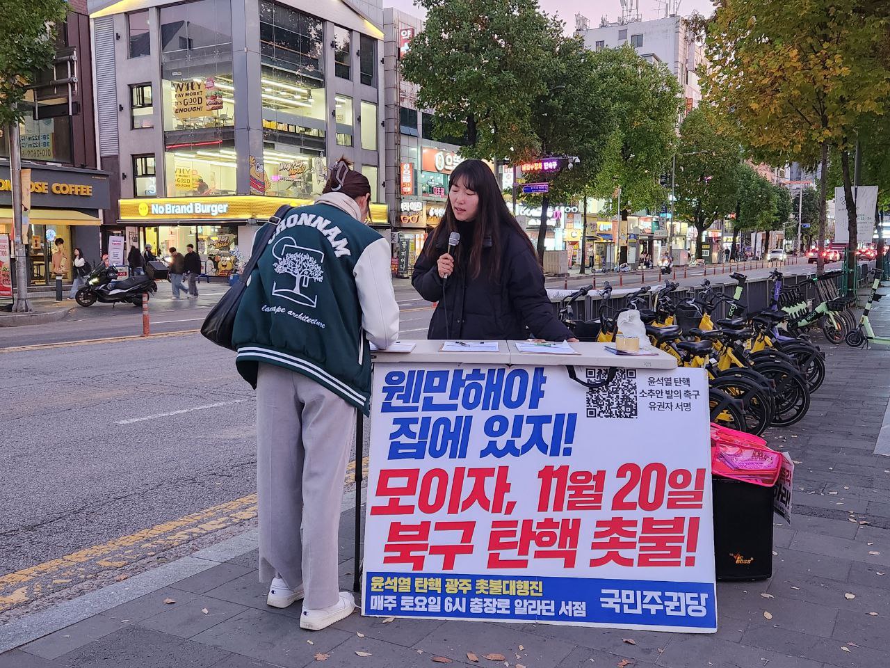 어제 전남대 축제 마지막 날을 맞아서 전대 후문에서 윤석열 탄핵 명령 유권자 서명운동과 북구 탄핵 촛불 홍보를 했습니다. 어린이가 고사리 손으로 사탕도 주고 가고, 윤석열 탄핵 시국선언에 동참한 교수님도 만났답니다. 탄핵 촛불에 대한 관심도 이어졌답니다 ㅎㅎ