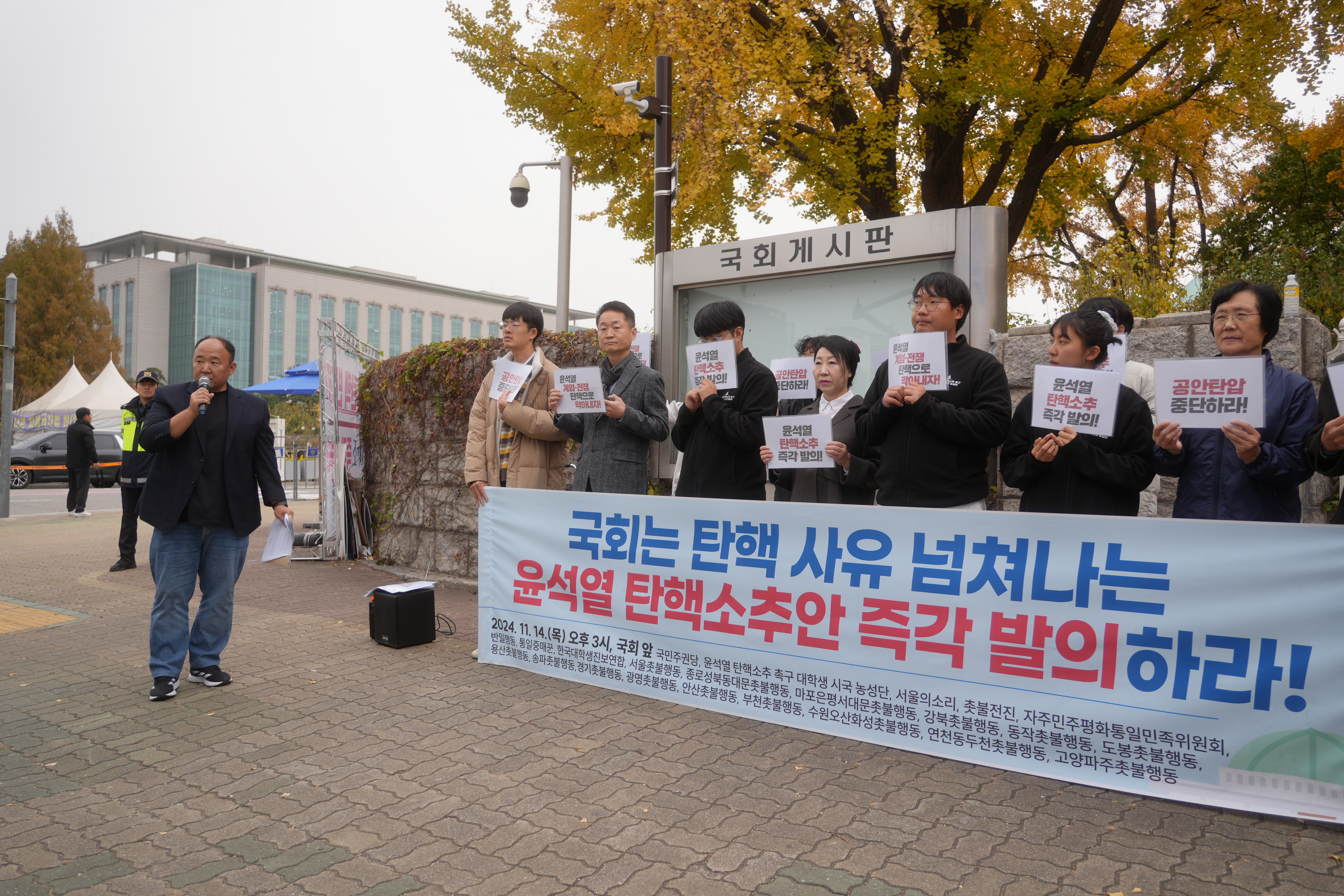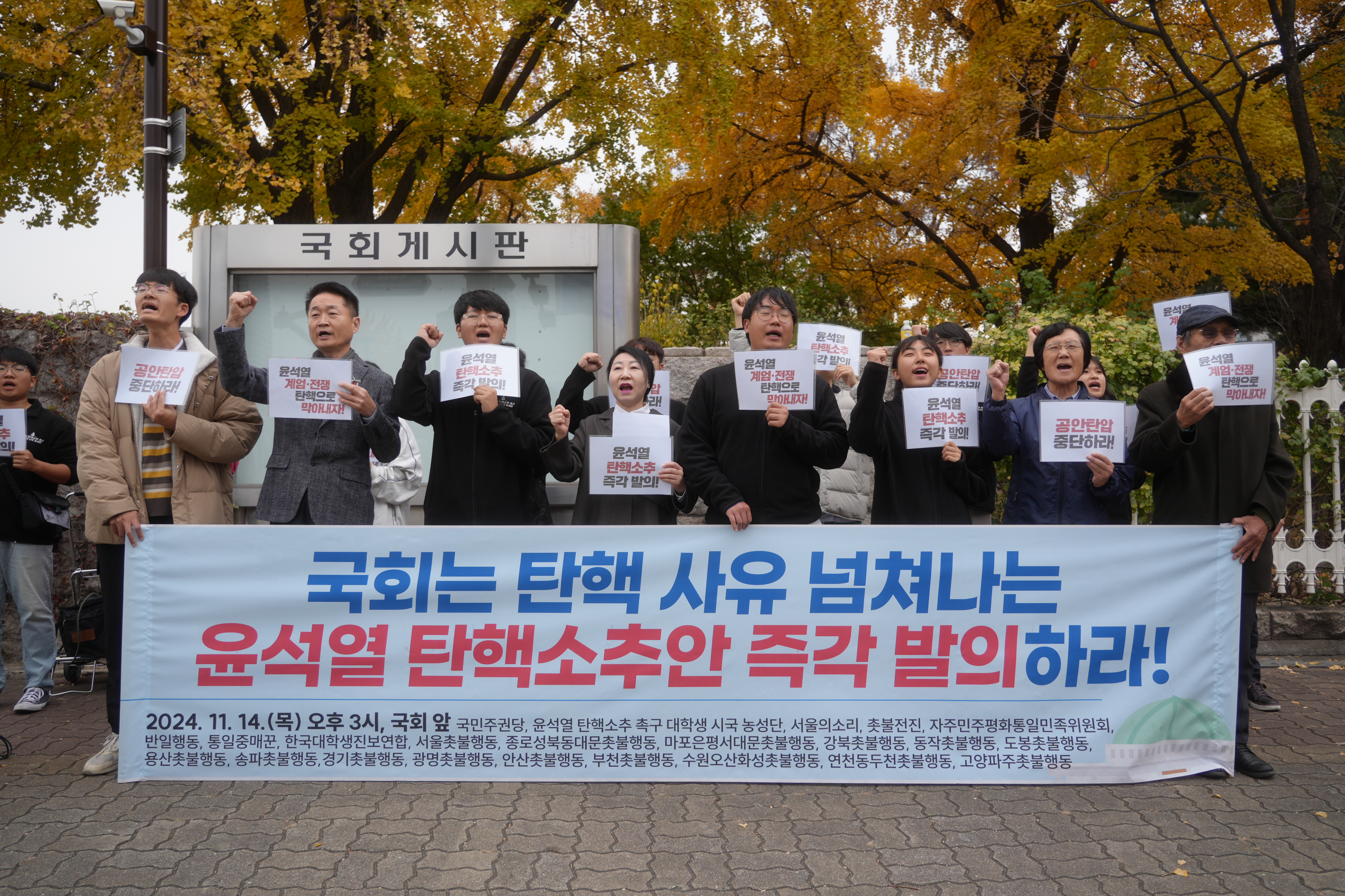 [단체] 국민주권당, 윤석열 탄핵소추 촉구 대학생 시국 농성단, 서울의소리, 촛불전진, 자주민주평화통일민족위원회, 반일행동, 통일중매꾼, 한국대학생진보연합, 서울촛불행동, 종로성북동대문촛불행동, 마포은평서대문촛불행동, 강북촛불행동, 동작촛불행동, 도봉촛불행동, 용산촛불행동, 강남서초촛불행동, 경기촛불행동, 광명촛불행동, 안산촛불행동, 부천촛불행동, 수원오산화성촛불행동, 연천동두천촛불행동, 고양파주촛불행동