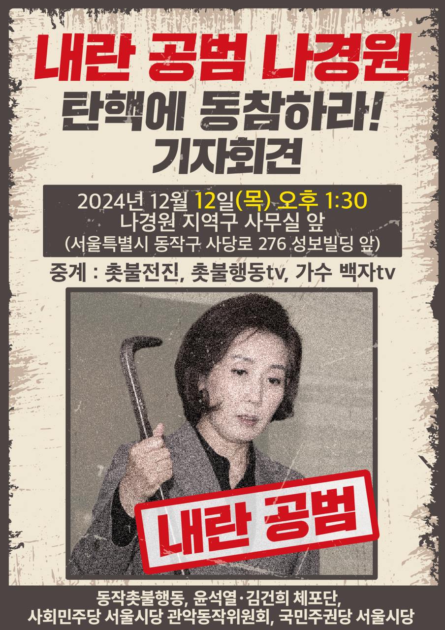 나경원에게 탄핵 동참을 강하게 촉구하는 기자회견이 예정되어 있으니 많은 관심과 참여 부탁드립니다.