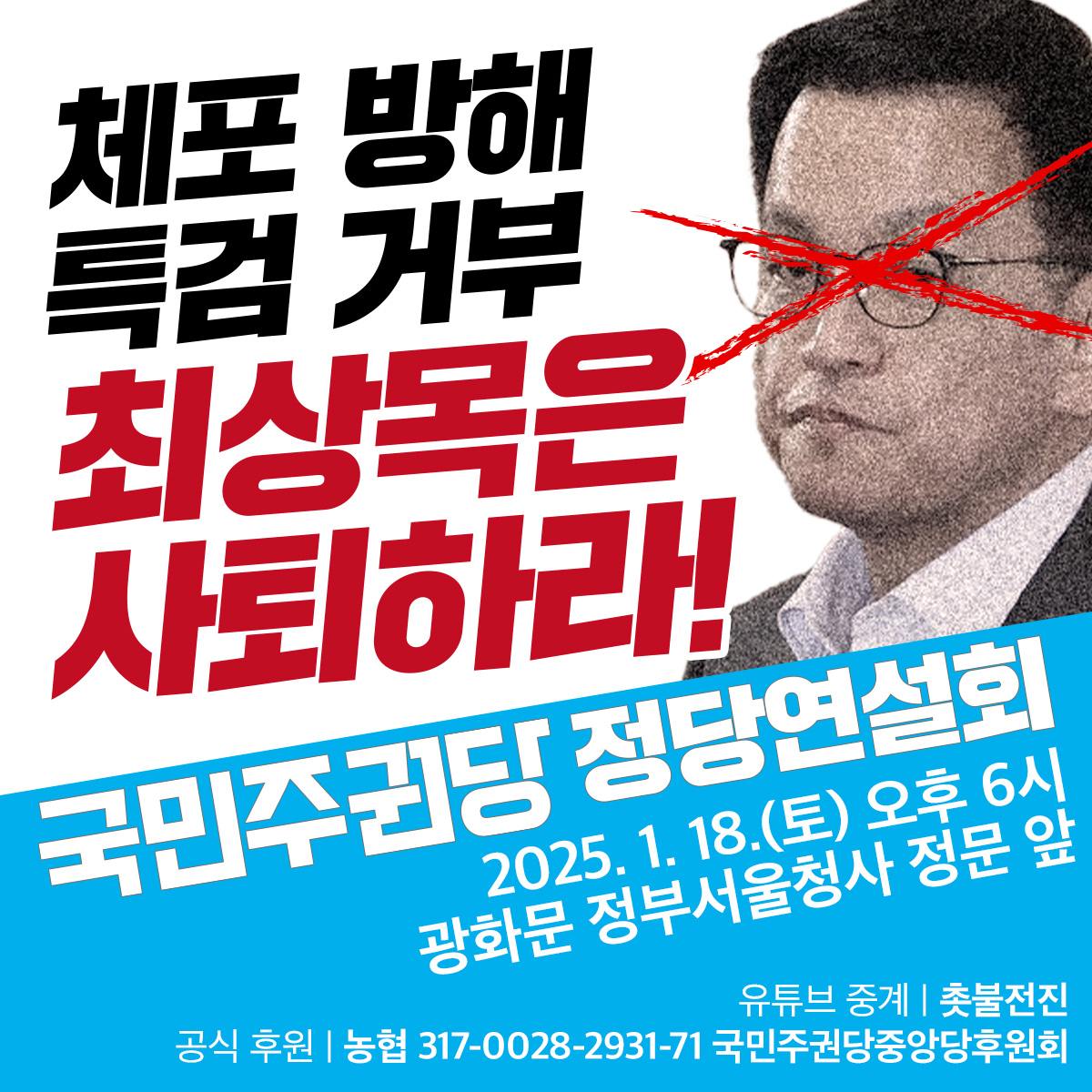 내란 부역자이자 윤석열 체포를 노골적으로 방해하고 헌법재판관 선별 임명에 이어 내란 특검도 거부하는 최상목이야말로 내란 대행자일 뿐입니다. 최상목은 즉각 물러나야 할 내란 동조범입니다. 정당연설회에 관심과 참여, 응원 바랍니다!
