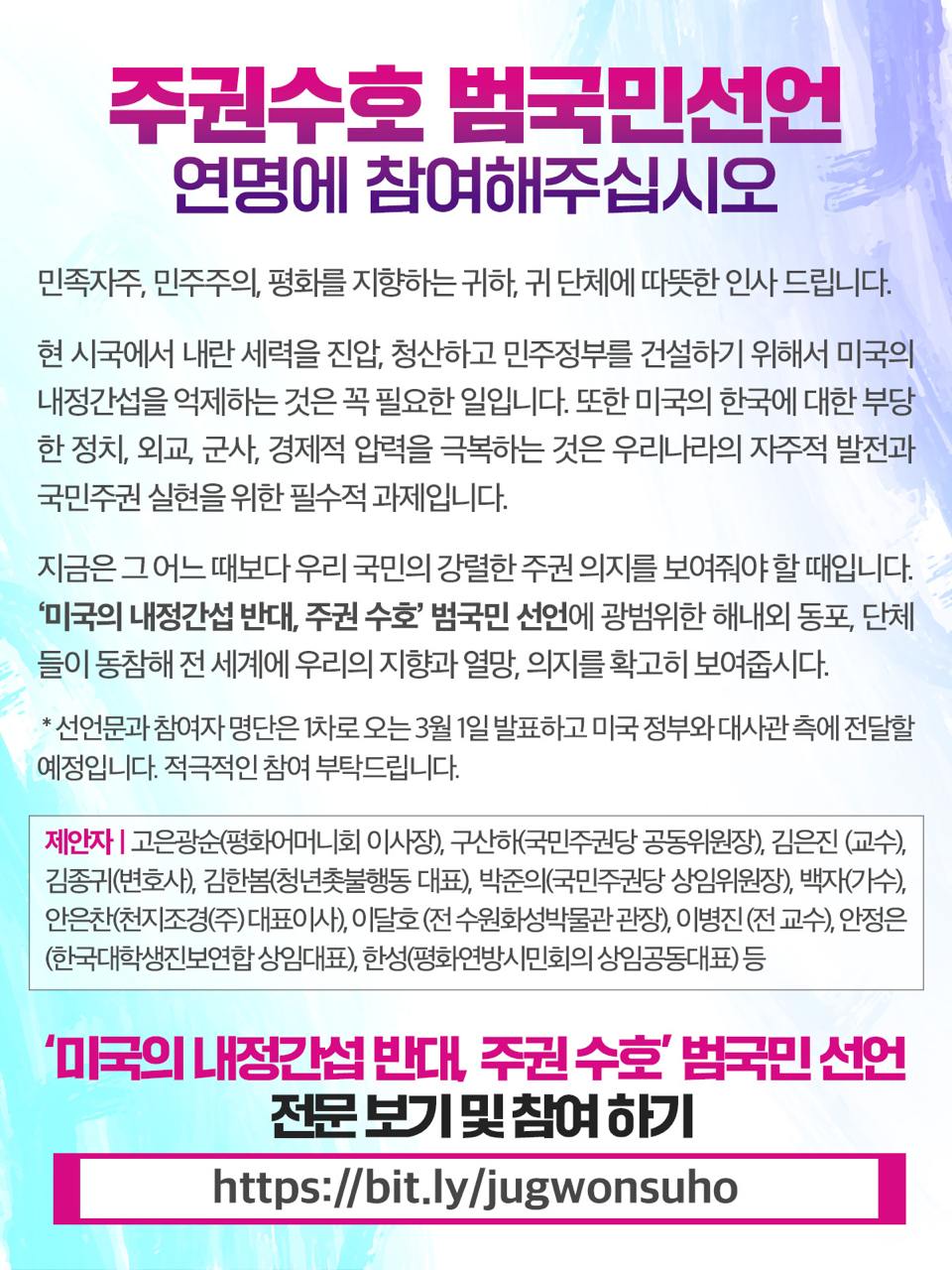 지금은 그 어느 때보다 우리 국민의 강렬한 주권 의지를 보여줘야 할 때입니다. <‘미국의 내정간섭 반대, 주권 수호’ 범국민 선언(아래 첨부)>에 광범위한 해내외 동포, 단체들이 동참해 전 세계에 우리의 지향과 열망, 의지를 확고히 보여줍시다.