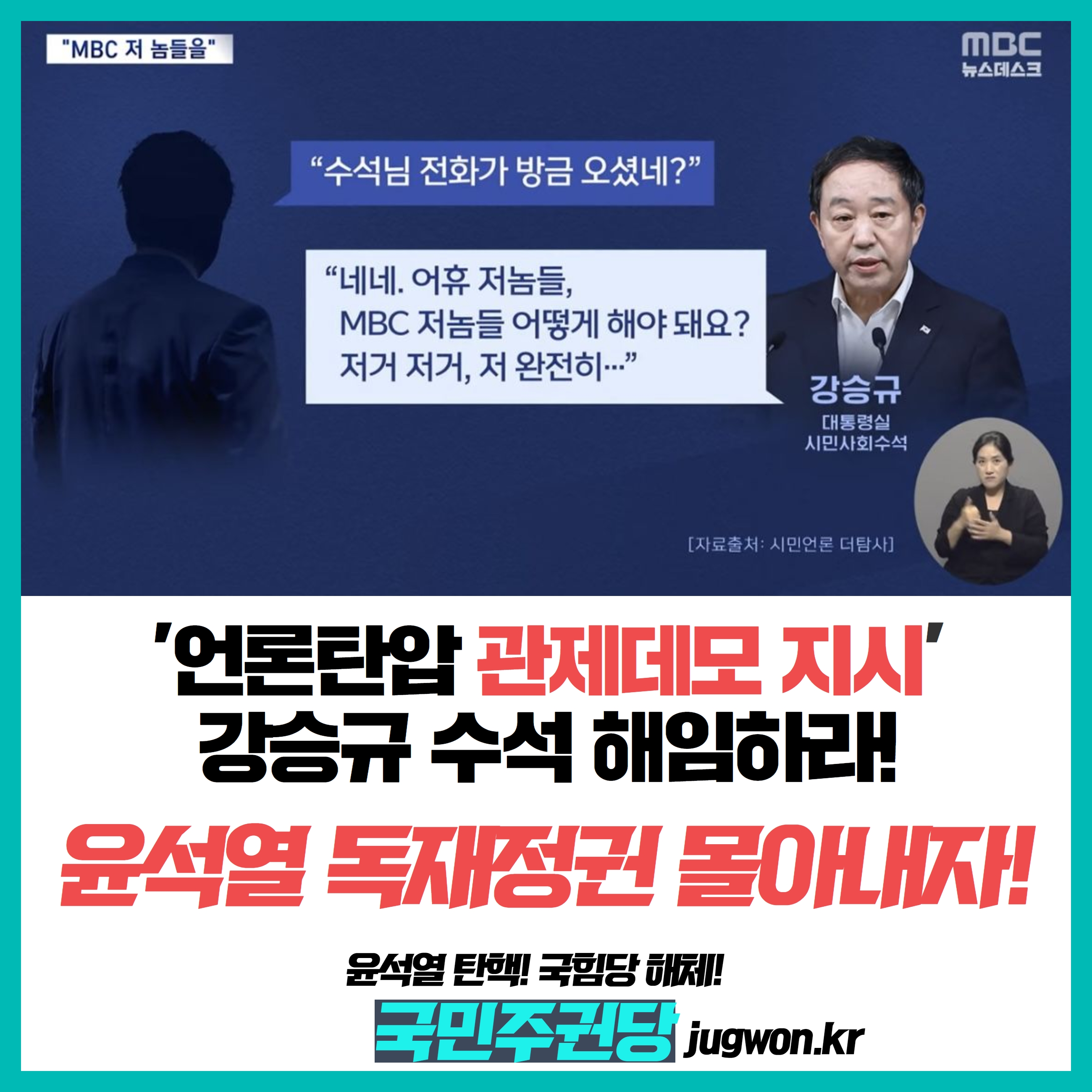 글 제목 : [논평] '언론탄압 관제데모 지시' 강승규 수석 해임하라! 윤석열 독재정권 몰아내자!