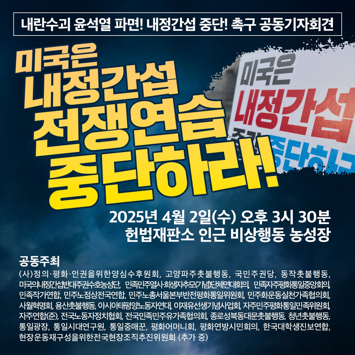 글 제목 : [안내] 4/2 내란수괴 윤석열 파면! 내정간섭 중단! 촉구 시민사회 공동 기자회견