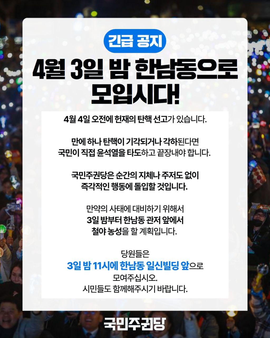 당원들은 3일 밤 11시에 한남동 일신빌딩 앞으로 모여주십시오. 시민들도 함께해주시기 바랍니다.