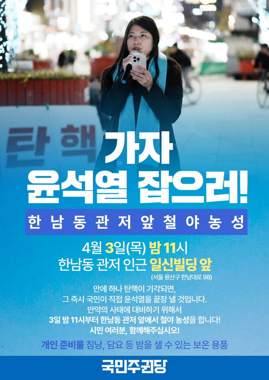 *만에 하나 기각되면, 그 즉시 국민이 직접 윤석열을 끝장 낼 것입니다. 만약의 사태에 대비하기 위해서 3일 밤 11시부터 한남동 관저 앞에서 철야 농성을 합니다.