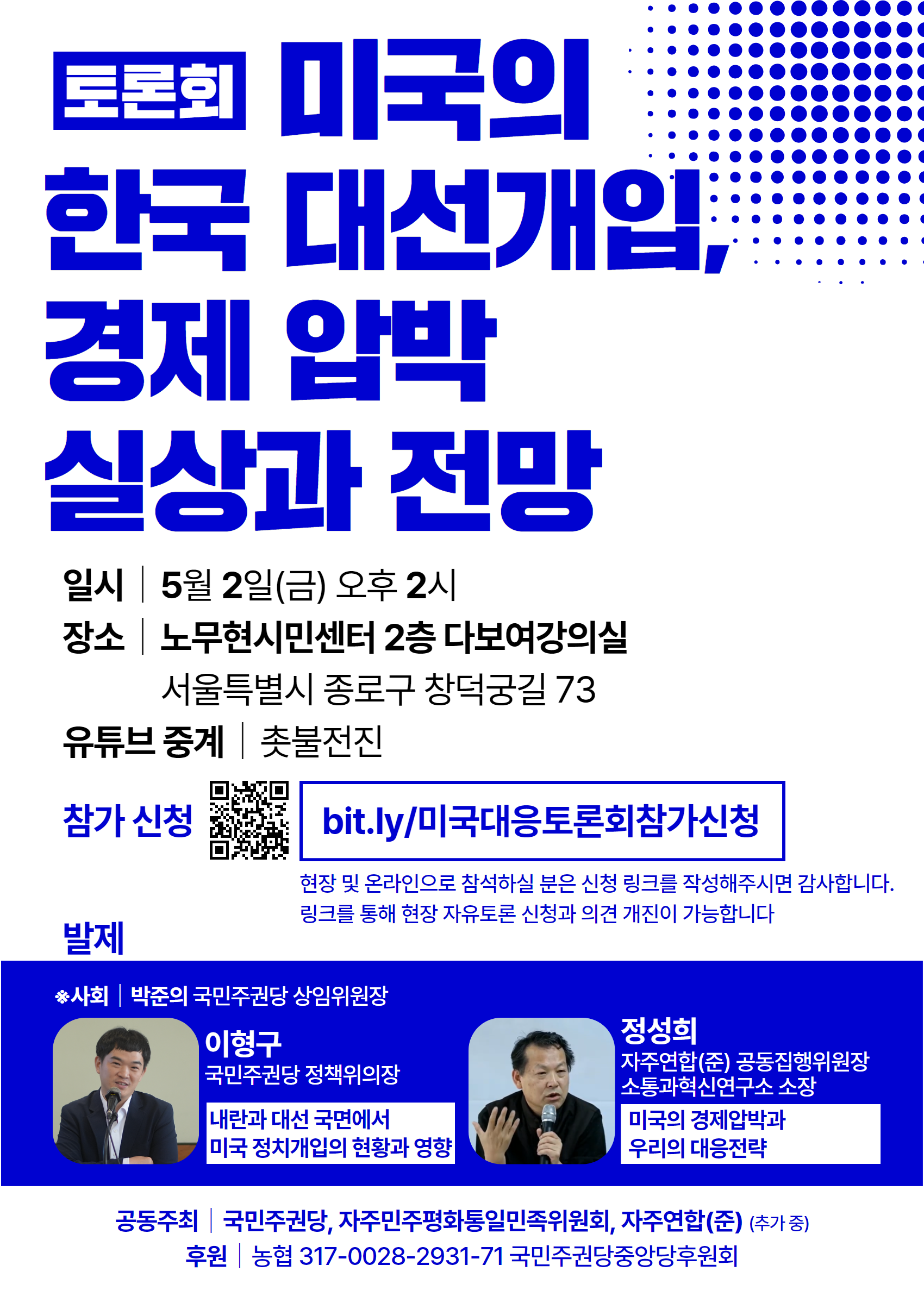 자주적이고 민주적인 사회를 만들어가기 위해, 국민주권당은 대선 시기 미국의 간섭과 압박을 극복할 방안을 모색하는 토론회를 진행합니다. 많은 분들의 관심과 참여를 부탁드립니다.