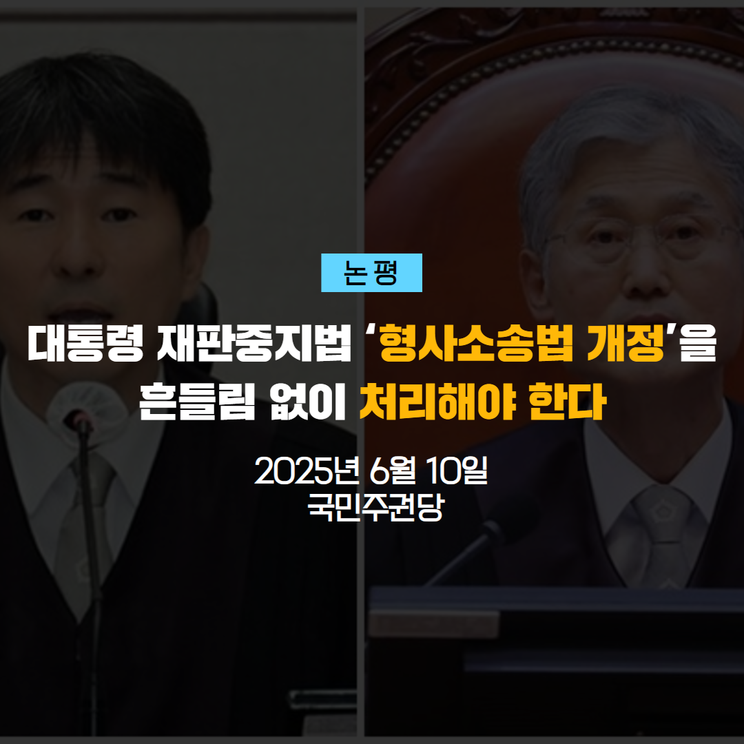 국힘당의 왜곡과 공격이 있더라도 국회는 형사소송법 개정안을 흔들림 없이 통과시켜야 한다. 그것이 사법부의 정치 개입을 방지하고 민주와 헌법을 수호하는 길이다.