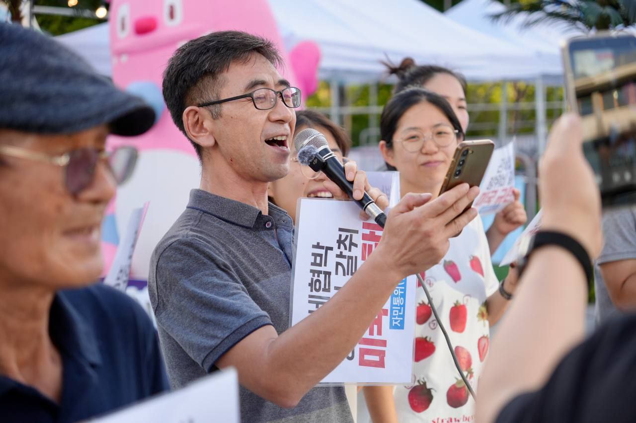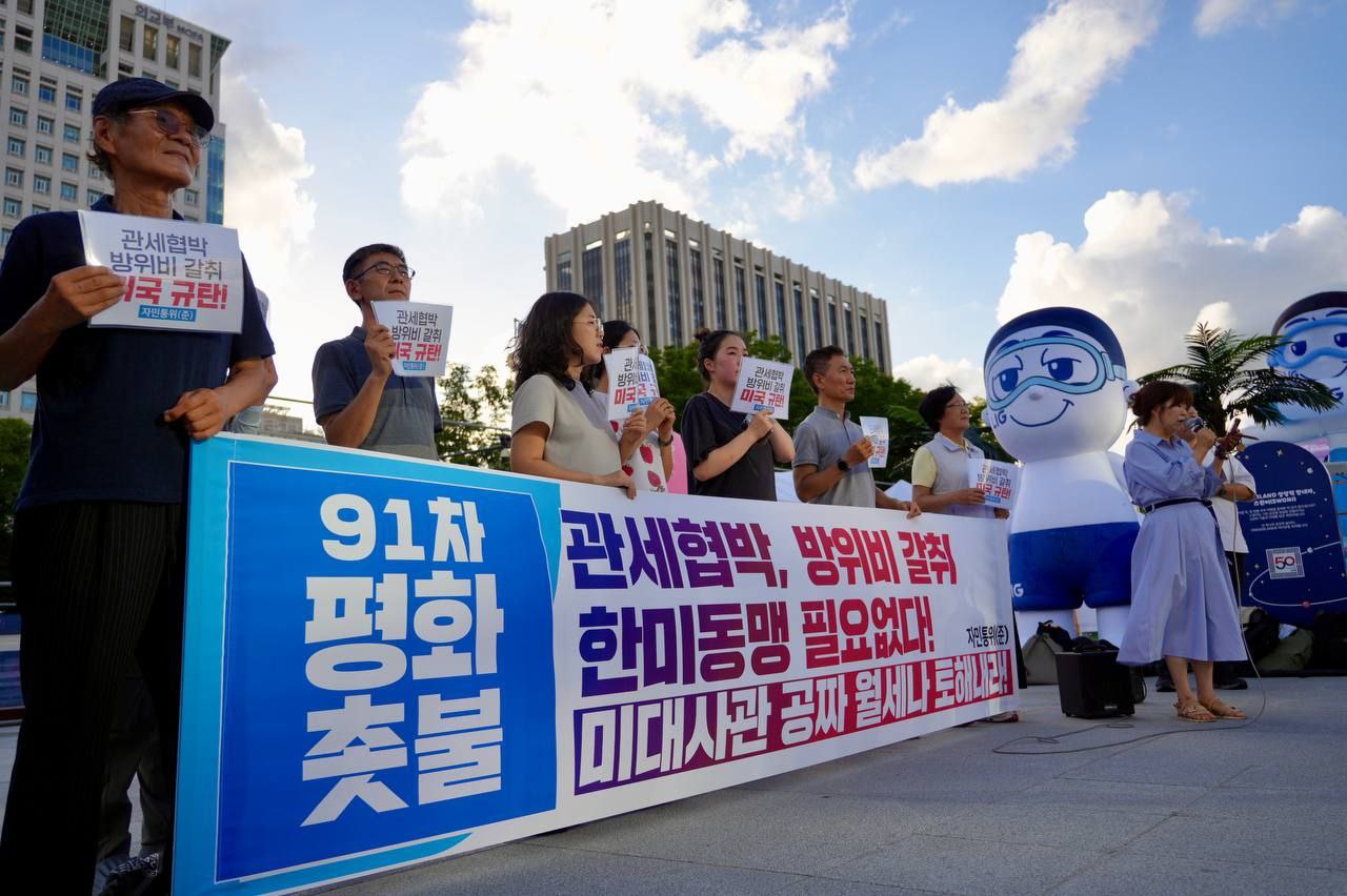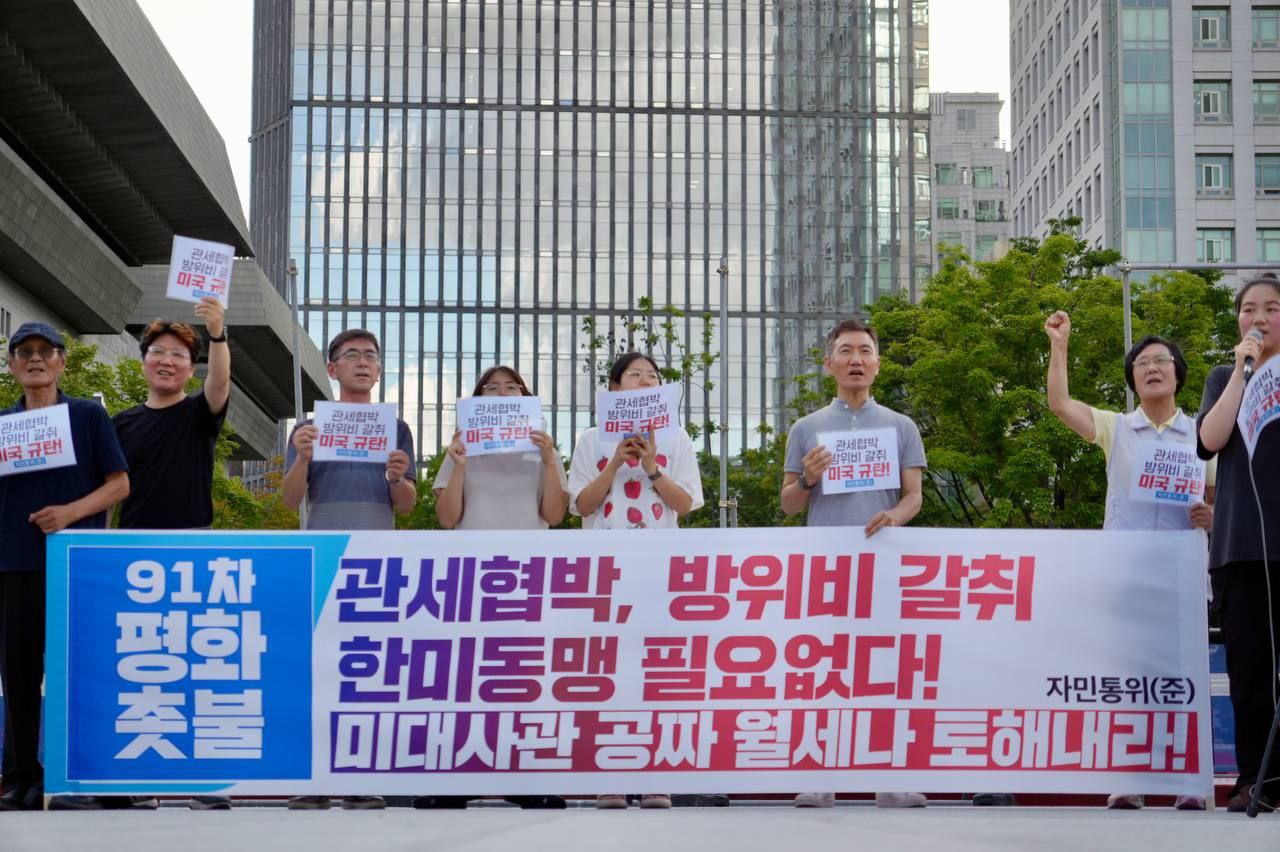 폭염에도 불구하고 부당한 미국의 요구를 저지하고 평화를 수호하기 위해 시민, 학생들이 모여 7월 21일 월요일 미대사관 앞에서 91차 평화촛불 집회를 진행했습니다. 집회에서는 "관세협박, 방위비강요 한미동맹 폐기하라!", "미대사관은 밀린 월세, 공짜 공과금이나 토해내라!" 구호를 외쳤습니다. 미국을 향해 '방 빼라', '돈 내라'하는 우리의 당연한 요구에 퇴근 길에 오른 시민들이 귀기울이고 관심을 가져 주셨습니다.