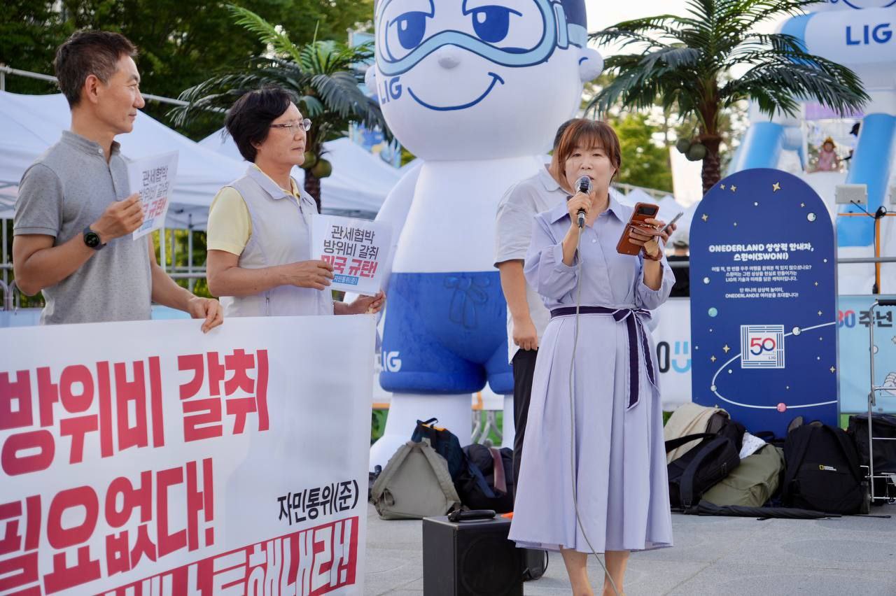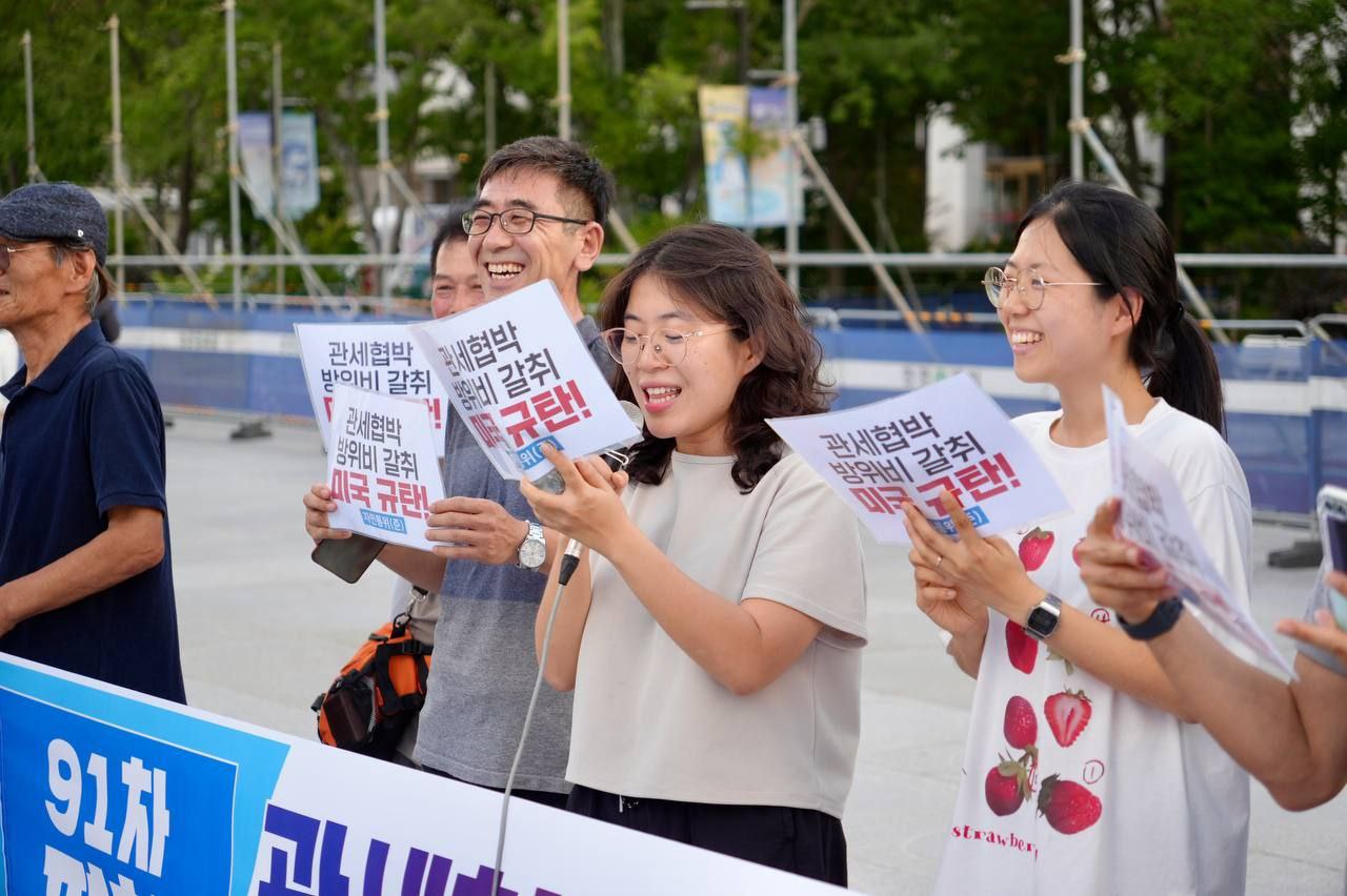 폭염에도 불구하고 부당한 미국의 요구를 저지하고 평화를 수호하기 위해 시민, 학생들이 모여 7월 21일 월요일 미대사관 앞에서 91차 평화촛불 집회를 진행했습니다. 집회에서는 "관세협박, 방위비강요 한미동맹 폐기하라!", "미대사관은 밀린 월세, 공짜 공과금이나 토해내라!" 구호를 외쳤습니다. 미국을 향해 '방 빼라', '돈 내라'하는 우리의 당연한 요구에 퇴근 길에 오른 시민들이 귀기울이고 관심을 가져 주셨습니다.