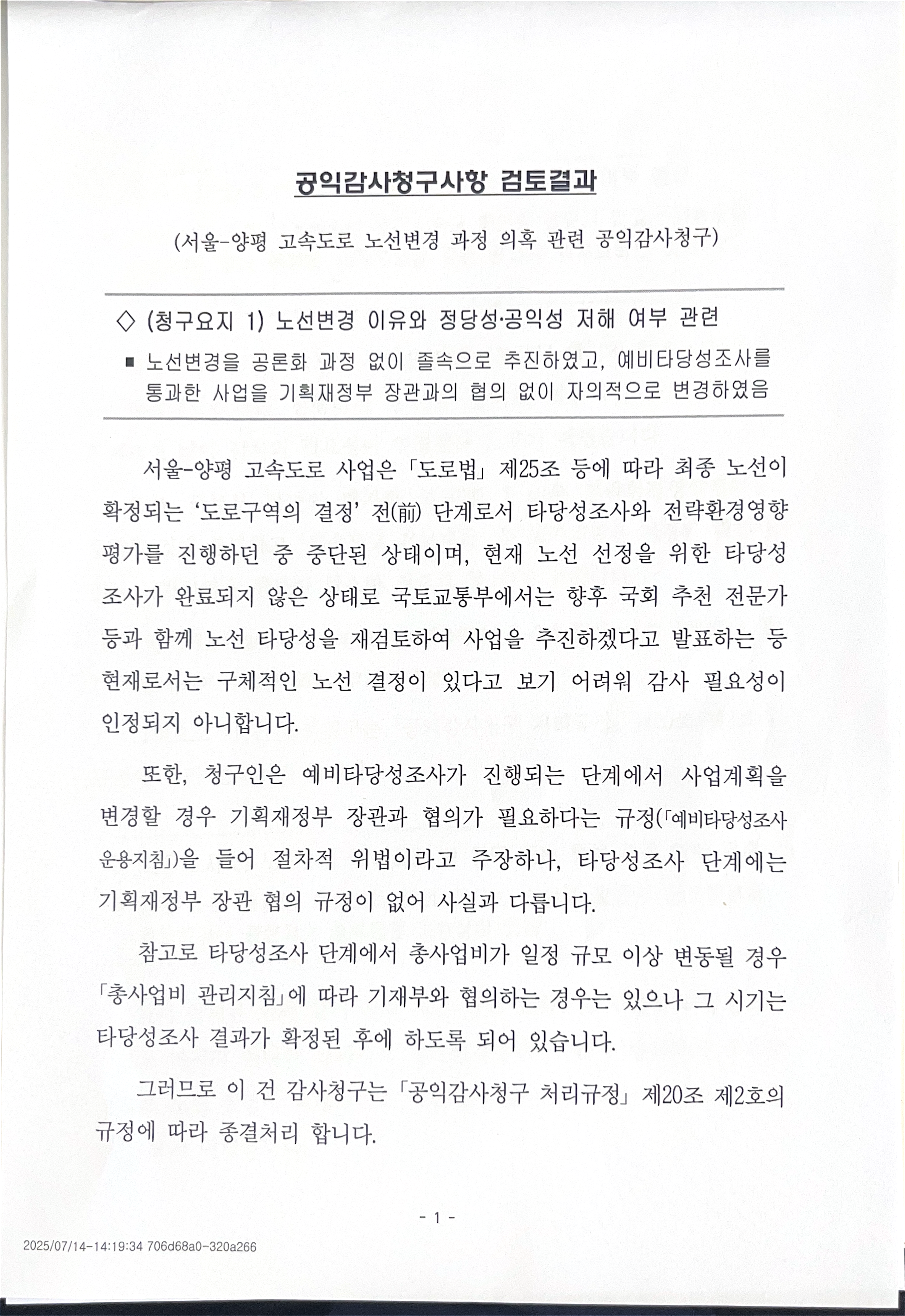 자료실/홍보자료실 2025. 7. 23. 서울-양평 고속도로 노선 변경 과정의 의혹에 대한 감사 청구 결과 글자 작게 글자 크게 인쇄 공유 닫기 이 글을 공유합니다. 카카오스토리 페이스북 네이버블로그 트위터 링크복사 글 작성 : 2025년 07월 23일 글 제목 : 서울-양평 고속도로 노선 변경 과정의 의혹에 대한 감사 청구 결과 ■ 감사원에 제출한 감사 청구서 공익감사 청구서.hwp 0.07MB ■ 감사원 답변 공유하기 게시글 관리 국민주권당 저작자표시 (새창열림)