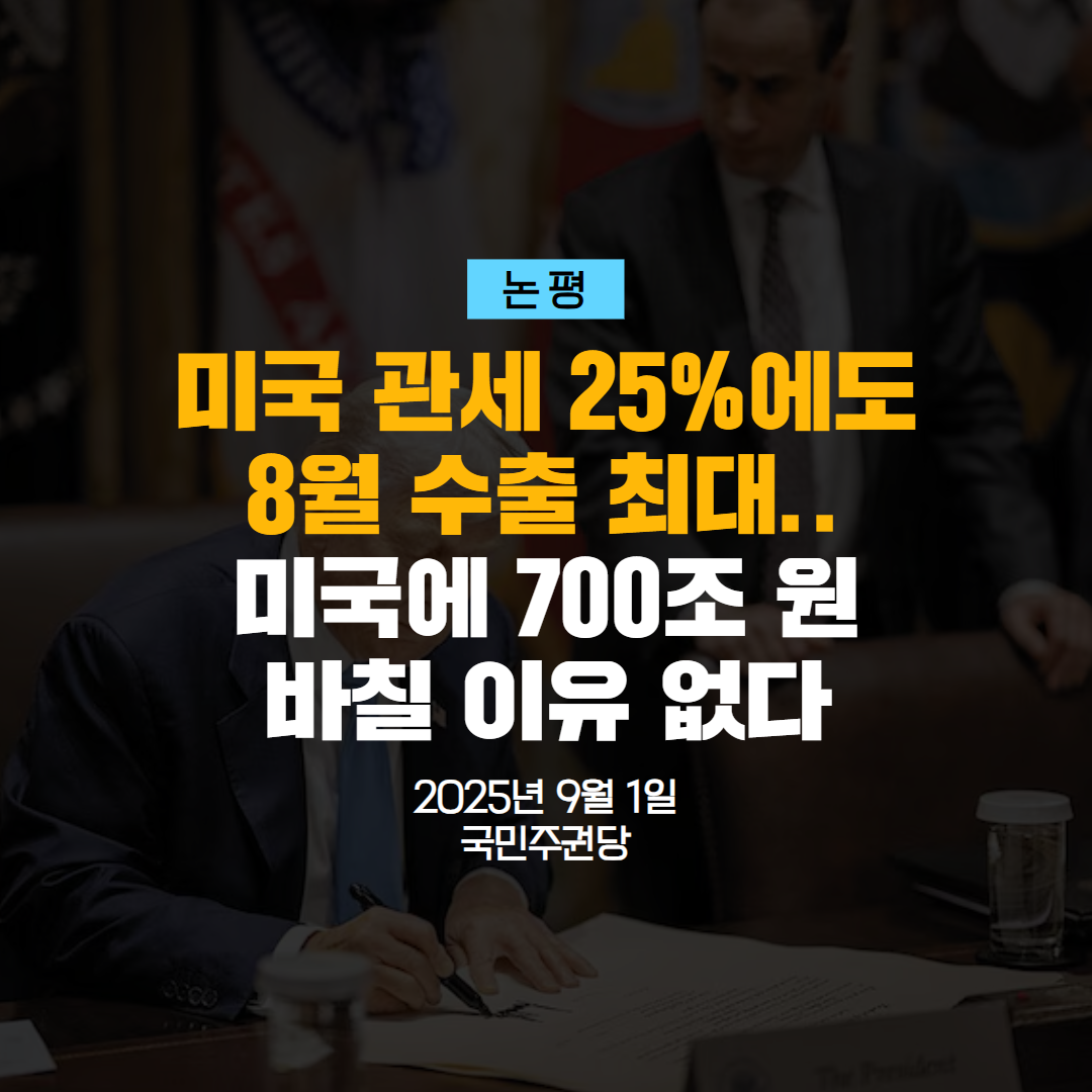 글 제목 : [논평] 미국 관세 25%에도 8월 수출 최대.. 미국에 700조 원 바칠 이유 없다
