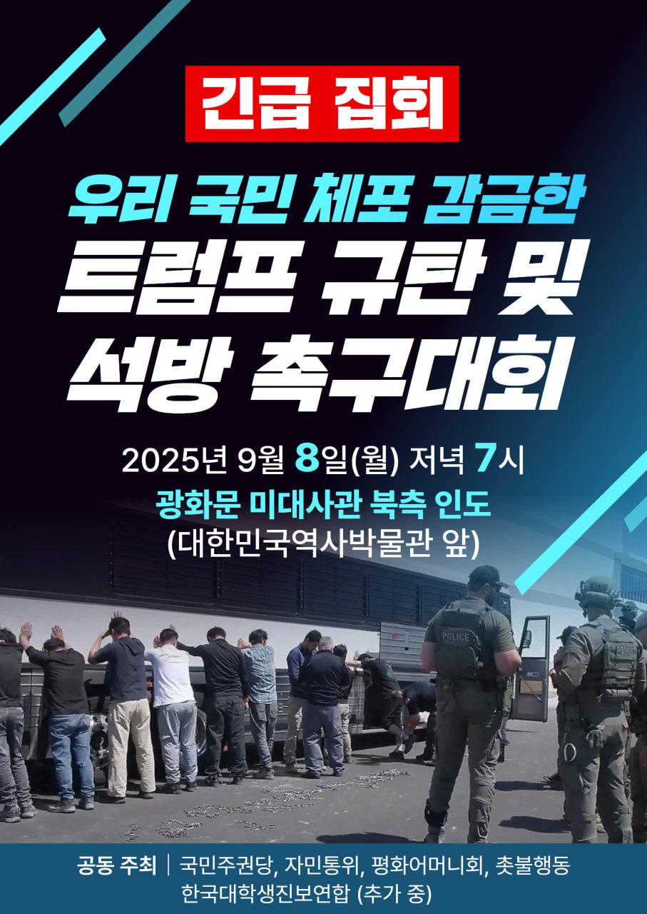 💥긴급💥 9/8(월) 오후 7시 미대사관 북측 <우리 국민 체포 감금한 트럼프 규탄 및 석방 촉구대회>