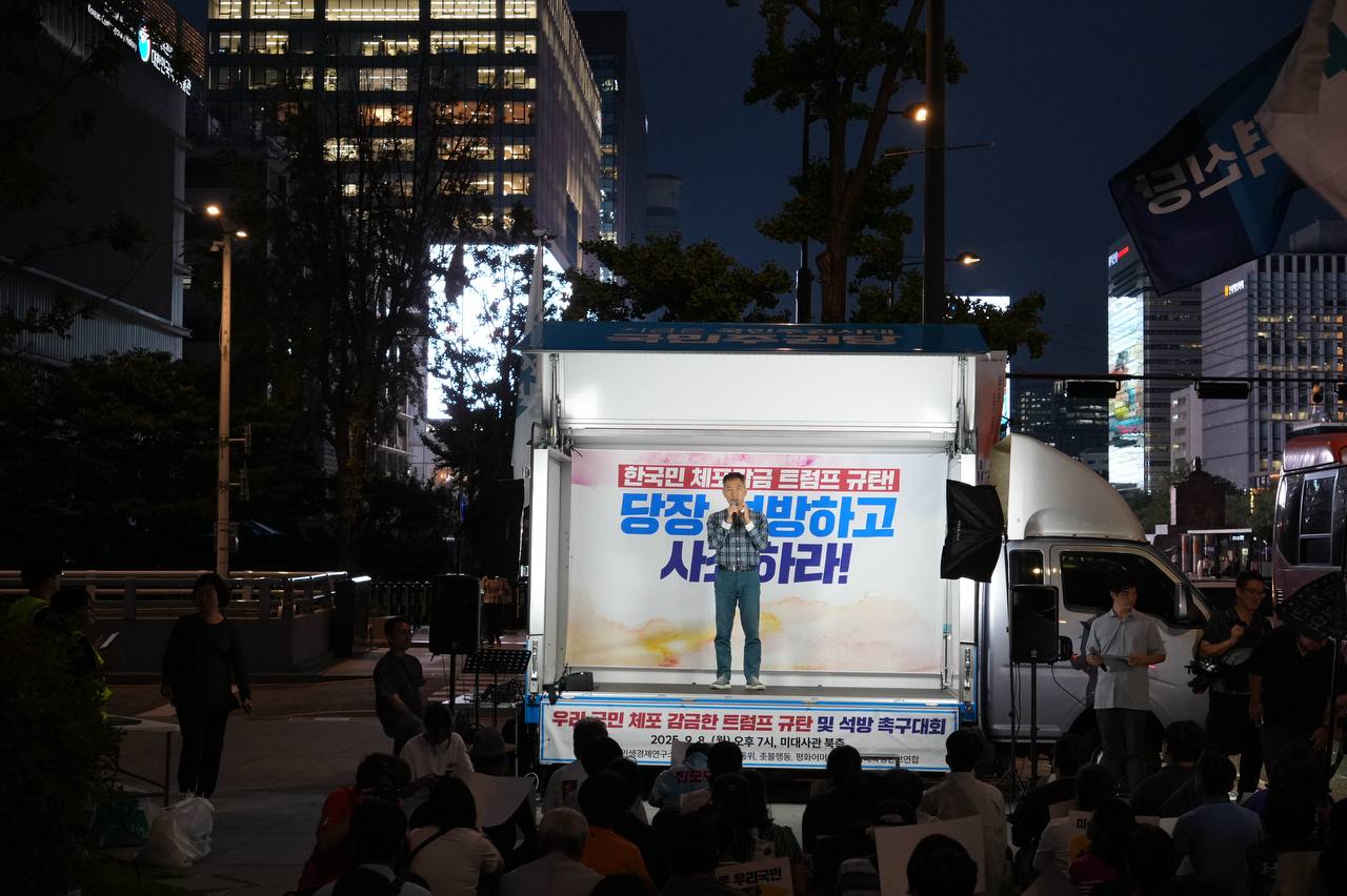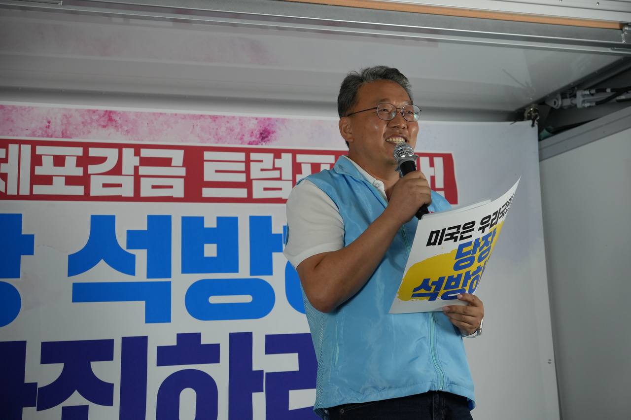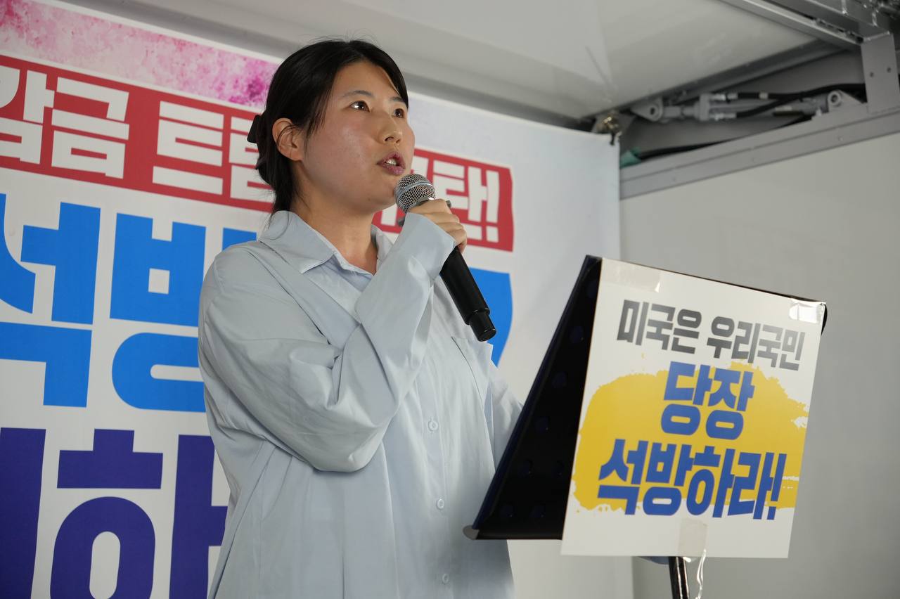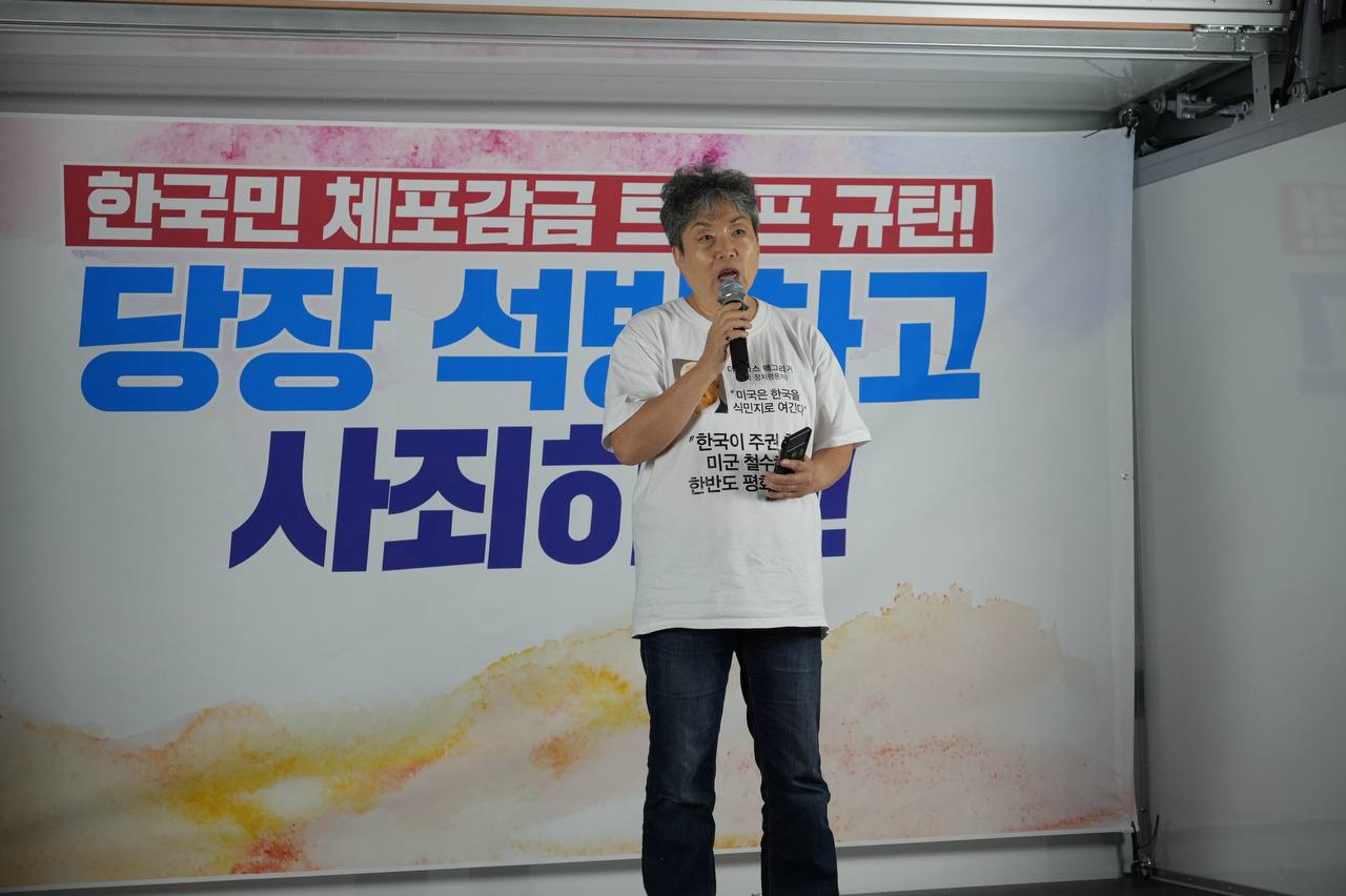 소식/활동 소식 2025. 9. 10. [사진] 9/8(월) 우리 국민 체포 감금한 트럼프 규탄 및 석방 촉구대회 글자 작게 글자 크게 인쇄 공유 닫기 이 글을 공유합니다. 카카오스토리 페이스북 네이버블로그 트위터 링크복사 글 작성 : 2025년 09월 10일 글 제목 : [사진] 9/8(월) 우리 국민 체포 감금한 트럼프 규탄 및 석방 촉구대회 ■ 중계 영상 ■ 사진 (왼쪽) 신동호 자주민주통일민족위원회 공동대표 (오른쪽) 고은광순 평화어머니회 상임대표 (왼쪽) 김용연 진보당 서울시당 위원장 (오른쪽) 안정은 한국대학생진보연합 상임대표 (왼쪽) 조하경 국민주권당 청년위원장 (오른쪽) 가수 백자 (왼쪽) 이형구 국민주권당 정책위 의장 공유하기 게시글 관리 국민주권당 저작자표시 (새창열림)