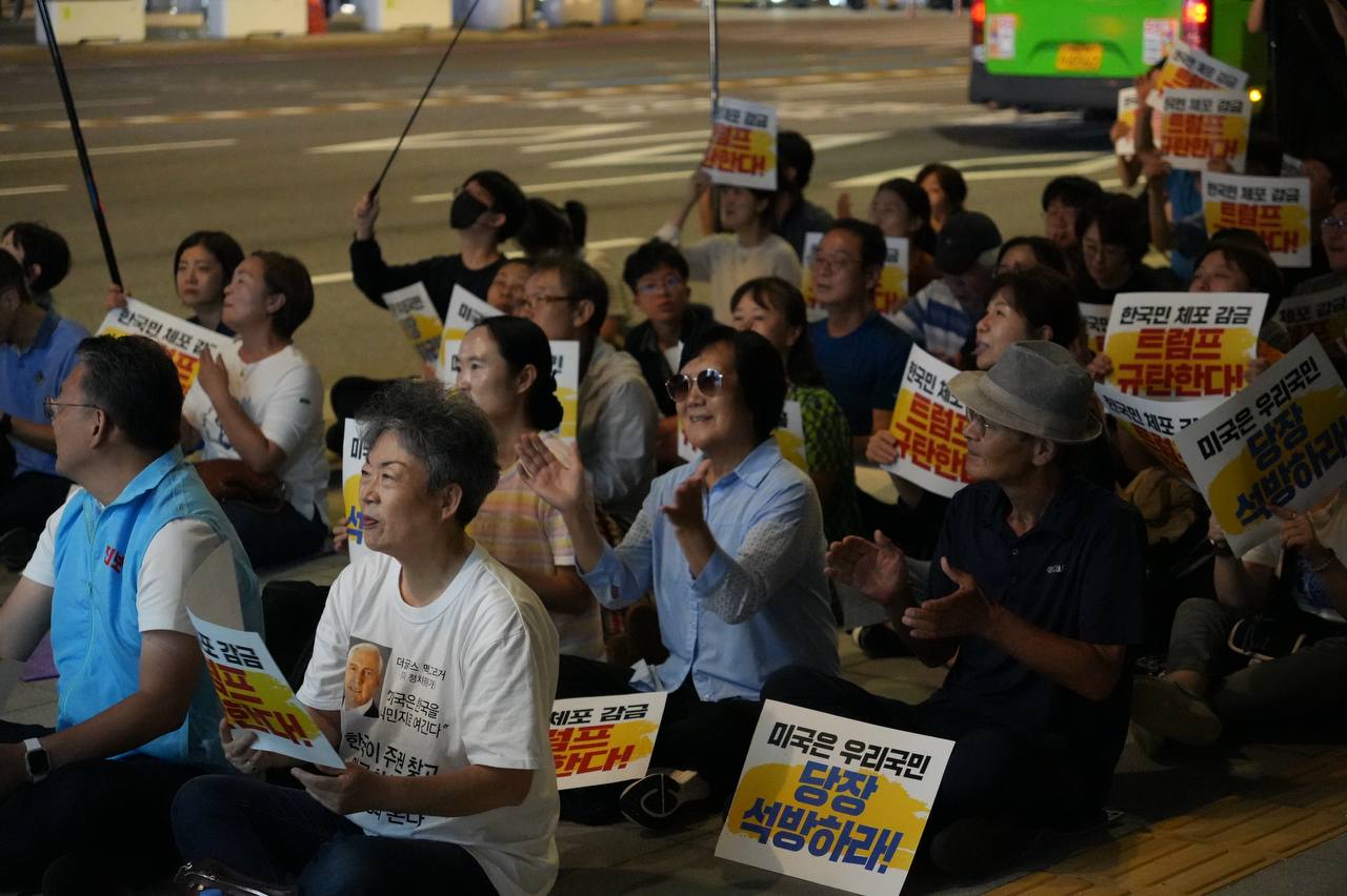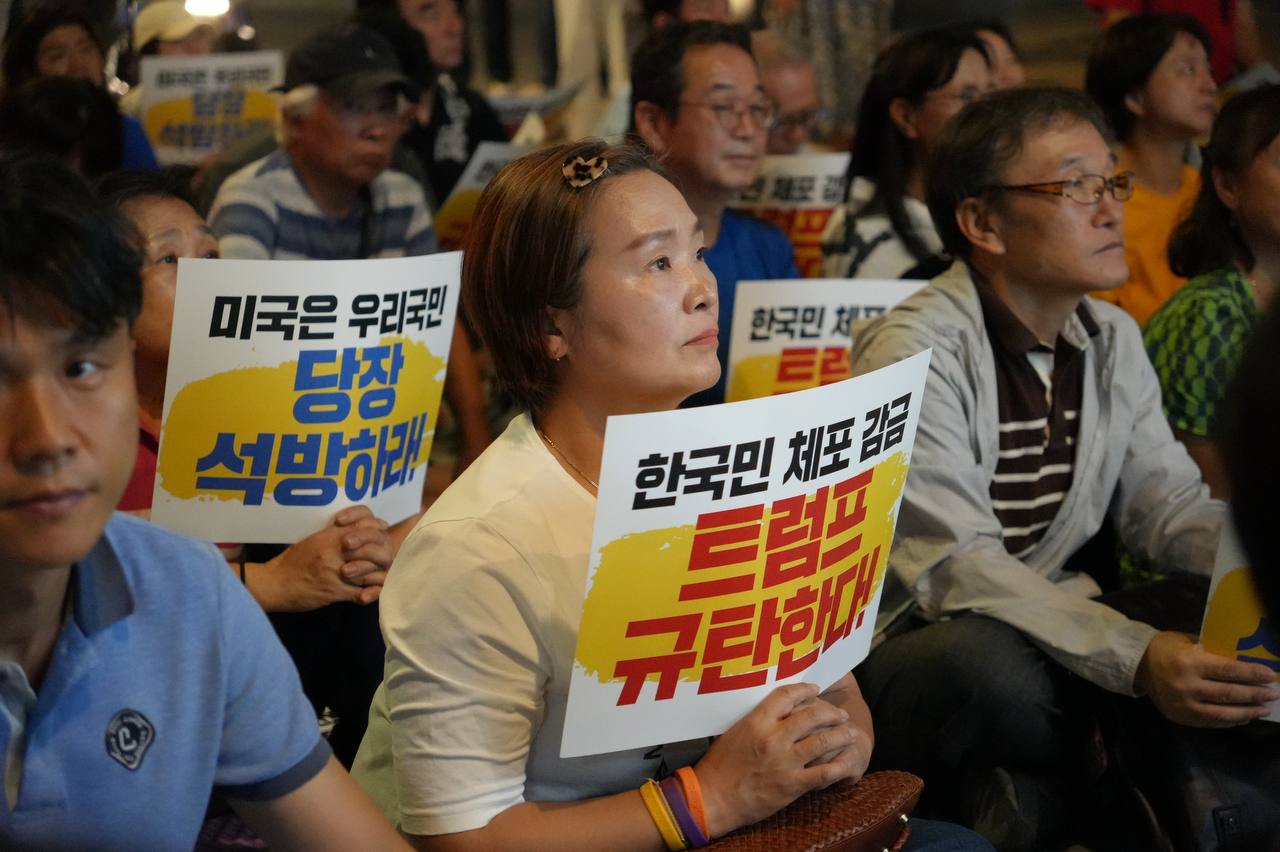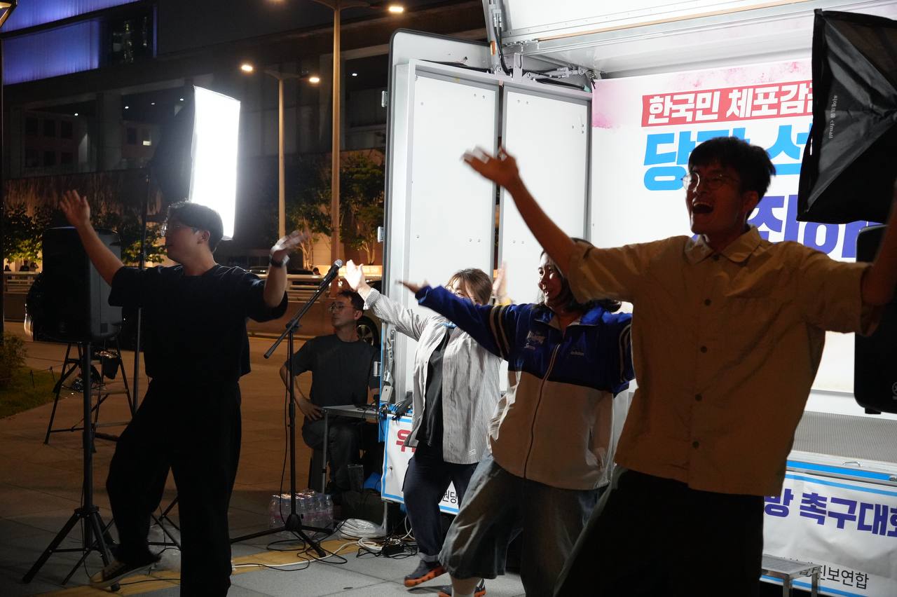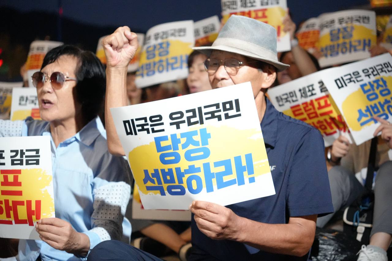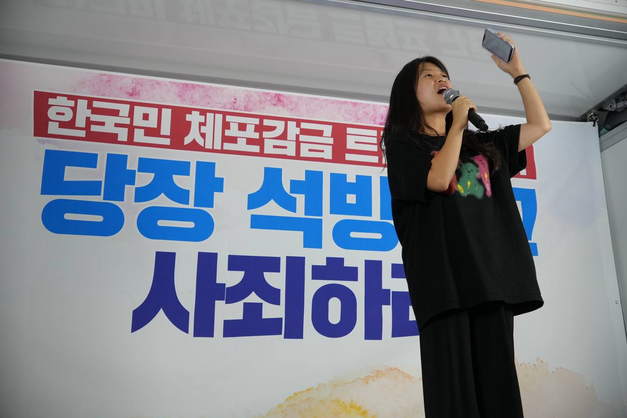 소식/활동 소식 2025. 9. 10. [사진] 9/8(월) 우리 국민 체포 감금한 트럼프 규탄 및 석방 촉구대회 글자 작게 글자 크게 인쇄 공유 닫기 이 글을 공유합니다. 카카오스토리 페이스북 네이버블로그 트위터 링크복사 글 작성 : 2025년 09월 10일 글 제목 : [사진] 9/8(월) 우리 국민 체포 감금한 트럼프 규탄 및 석방 촉구대회 ■ 중계 영상 ■ 사진 (왼쪽) 신동호 자주민주통일민족위원회 공동대표 (오른쪽) 고은광순 평화어머니회 상임대표 (왼쪽) 김용연 진보당 서울시당 위원장 (오른쪽) 안정은 한국대학생진보연합 상임대표 (왼쪽) 조하경 국민주권당 청년위원장 (오른쪽) 가수 백자 (왼쪽) 이형구 국민주권당 정책위 의장 공유하기 게시글 관리 국민주권당 저작자표시 (새창열림)